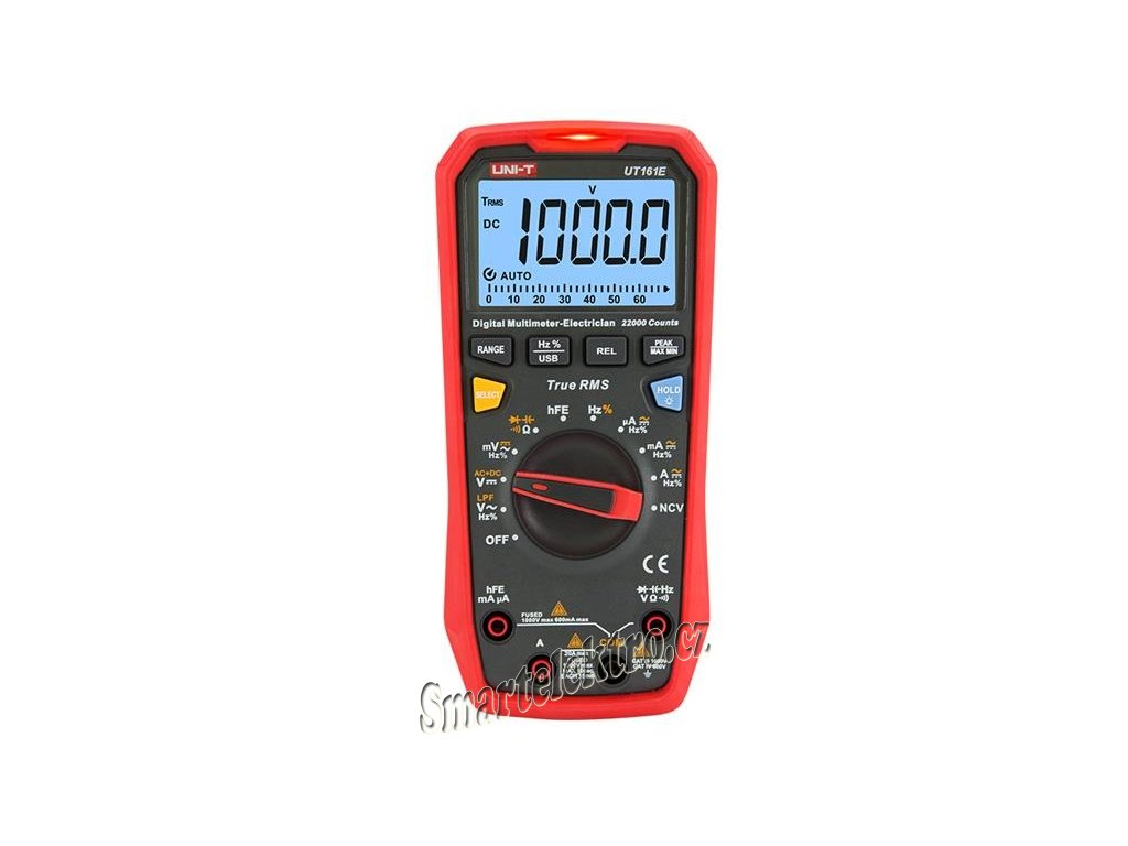 Na tento výrobek poskytujeme 3 roky záruku. Řada multimetrů UT161 je řada vysoce spolehlivých, bezpečných, odolných a přesných multimetrů, které mají certifikát CE a jsou vhodné pro evropský trh. Displeje těchto multimetrů jsou podsvícené LCD (tmavé údaje na světlém pozadí) s počtem míst ±6000 (pro UT161B a UT161D) a ±22000 pro UT161E. Displeje mají obnovovací frekvenci 2 - 3x za vteřinu, obsahují také analogový sloupec se 31 segmenty (UT161B a UT161D) nebo 41 segmenty (UT161E). Multimetry měří AC i DC napětí do 1000V a jsou vybaveny zvukovým a optickým varováním při dosažení maximálních hodnot napětí / proudu, příp. teploty. Umožňuje bezkontaktní detekci vodičů s AC napětím. V balení je obsažen USB kabel s optoelektrickým převodníkem pro přenos dat do PC. Napájení je čtyřmi kusy mikrotužkových baterií AAA (R03) a přístroj se automaticky vypíná po 15ti minutách nečinnosti (funkci lze dočasně vypnout). Jištění proudových vstupů je provedeno trubičkovými pojistkami a pojistky je možné testovat bez otevření přístroje.
