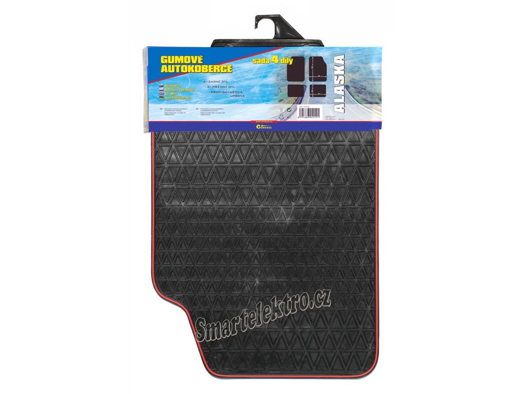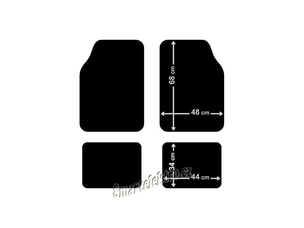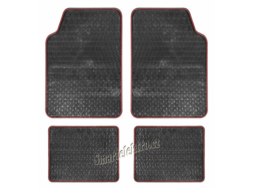 Sada 4 kusy (2x přední, 2x zadní díl), materiál guma, provedení černé s červenou linkou. Velikost předního koberce 68 x 48 cm, zadního 34 x 44 cm.