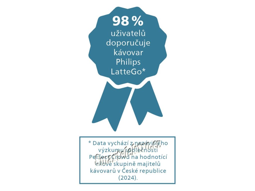 Napěňovač mléka LatteGo velmi rychle vyčístíte. Skládá se jen ze dvou dílů a nemá žádné hadičky, takže jej snadno propláchnete pod tekoucí vodou a vyčistíte za pouhých 10 sekund, nebo vložíte do myčky nádobí. Kávovary Philips nenabízejí automatické čištění, protože vyžaduje dodatečné čištění.