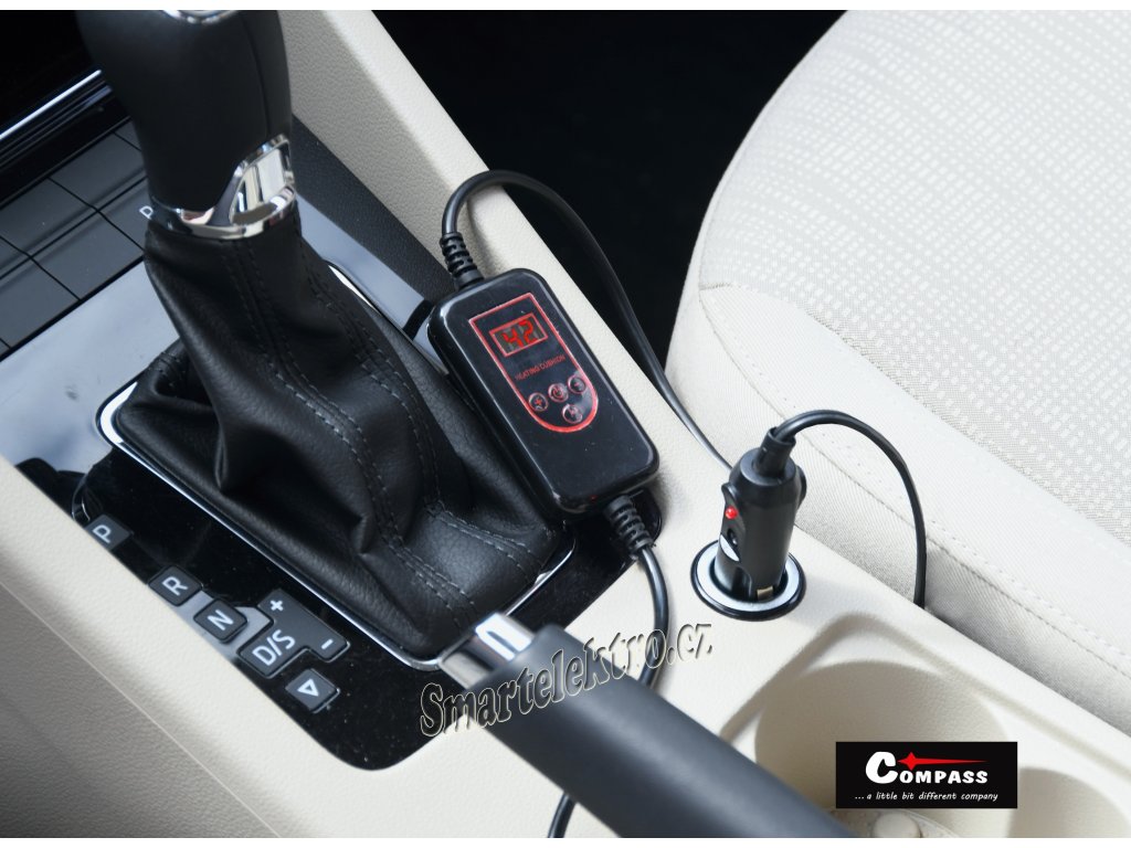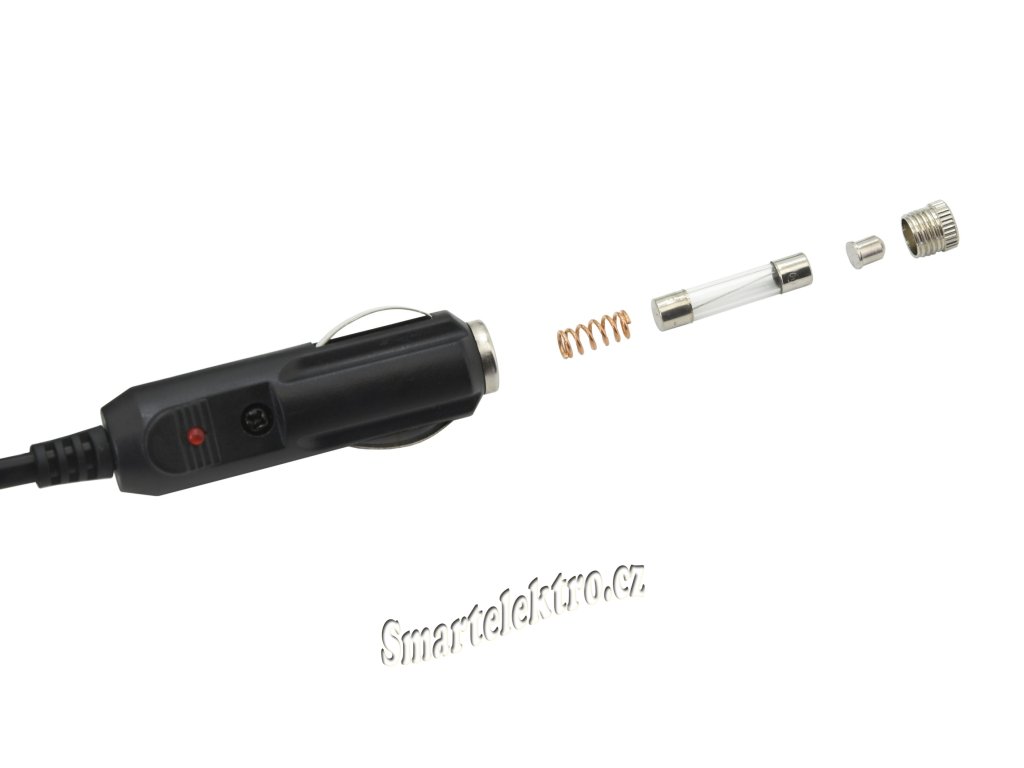 Zapojení do běžné zásuvky automobilového zapalovače 12V konektorem. Zásuvka je opatřená skleněnou pojistkou.