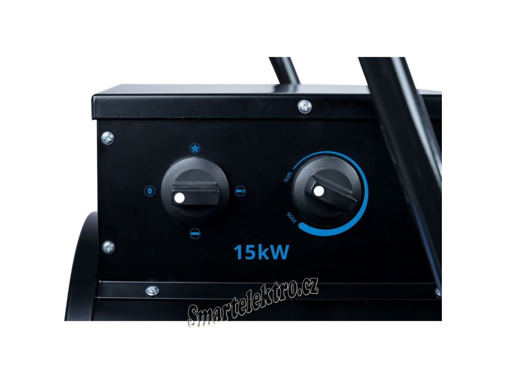 Dva stupně vytápění (7,5 kW - 15 kW) • zahřívání vzduchu bez spotřeby kyslíku nebo zápachu spalin • rychlé rozptýlení horkého vzduchu ventilátorem.