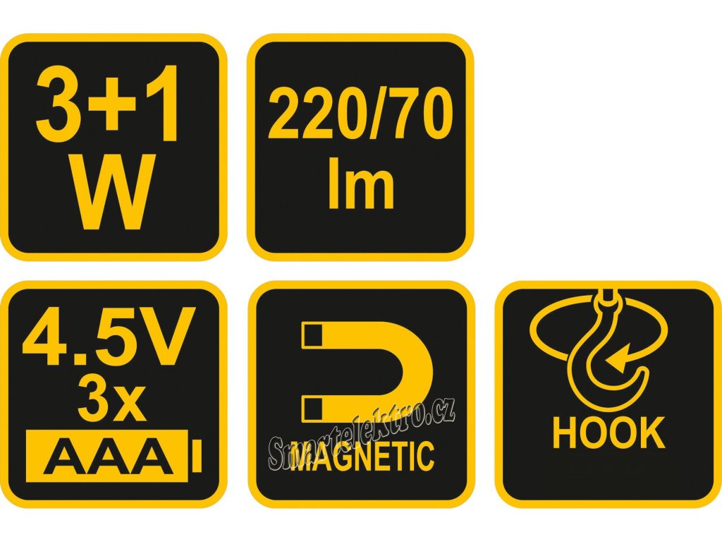 Montážní LED svítilna s bodovým a bočním osvětlením, s háčkem a magnetem pro uchycení.
