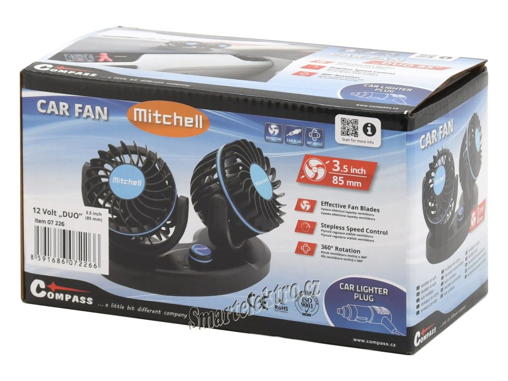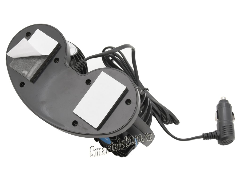 Napájení 12 V ze zásuvky autozapalovače. Oba ventilátory průměru 8,5 cm lze nezávisle na sobě natočit libovolným směrem. Sestava ventilátorů se upevňuje pomocí přiložených dvou kusů lepících destiček, které zajišťují precizní a silné uchycení.