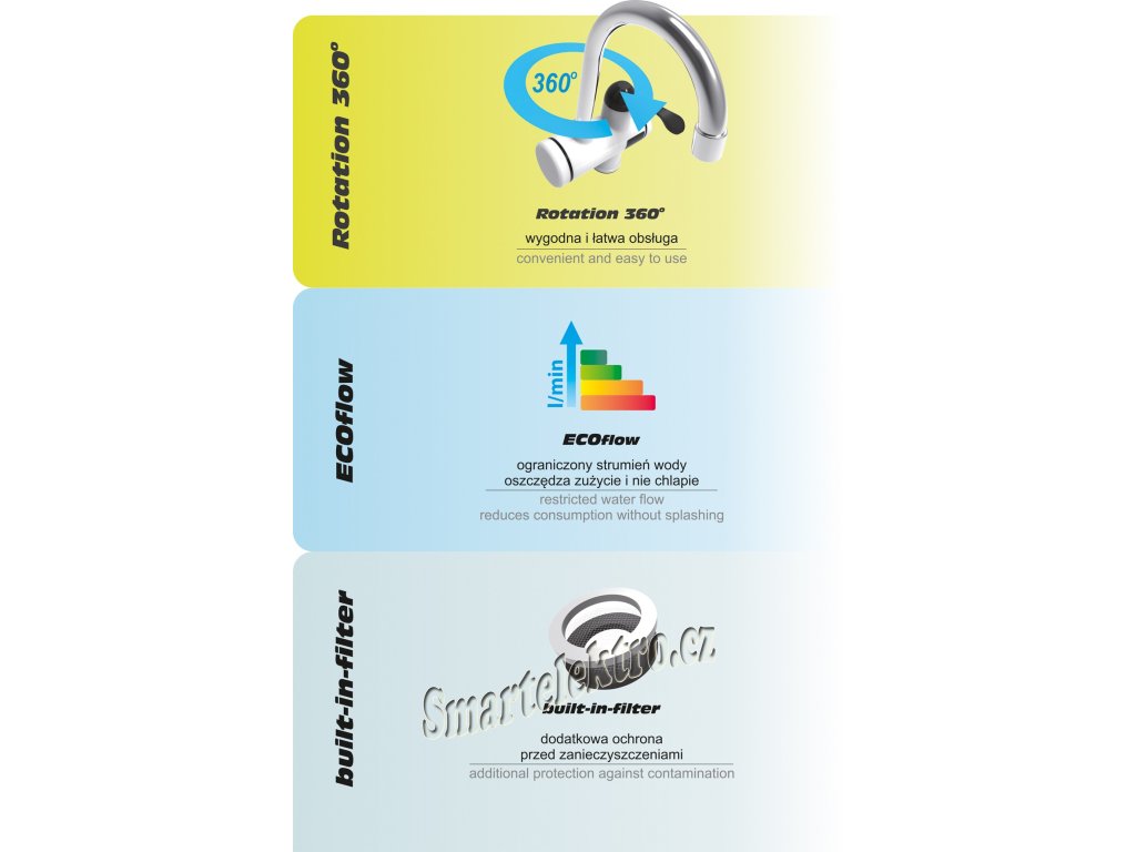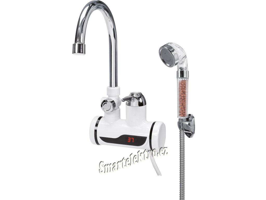 Průtokový ohřívač o výkonu 3000W, umožňuje ohřát vodu na 60 ° C za 5 sekund. Snadno čitelný LED displej, který umožňuje kontrolovat teplotu vody.
