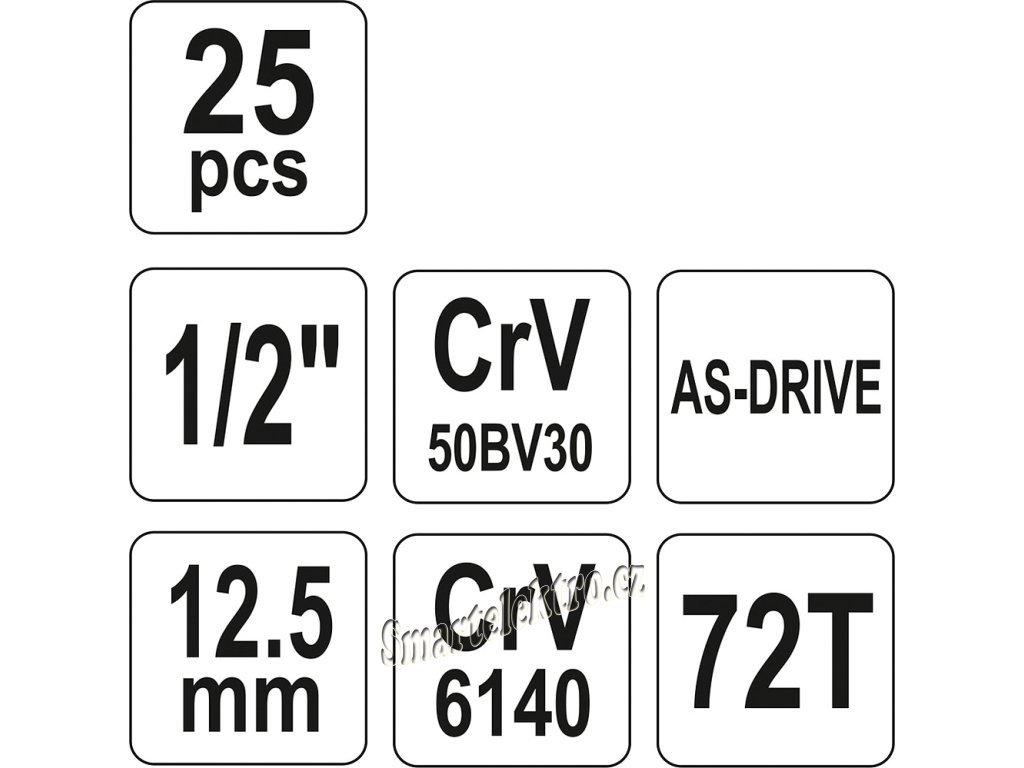 Gola sada 1/2" obsahuje 25ks: nástavců, prodlužovacích nástavců, ráčnu s plastovou rukojetí a další příslušenství. Vyrobené z kvalitní chromvanadiové oceli CrV6140 a CrV50BV30 s funkcí AS-DRIVE. Ráčna má jemný 72 zubý chod.