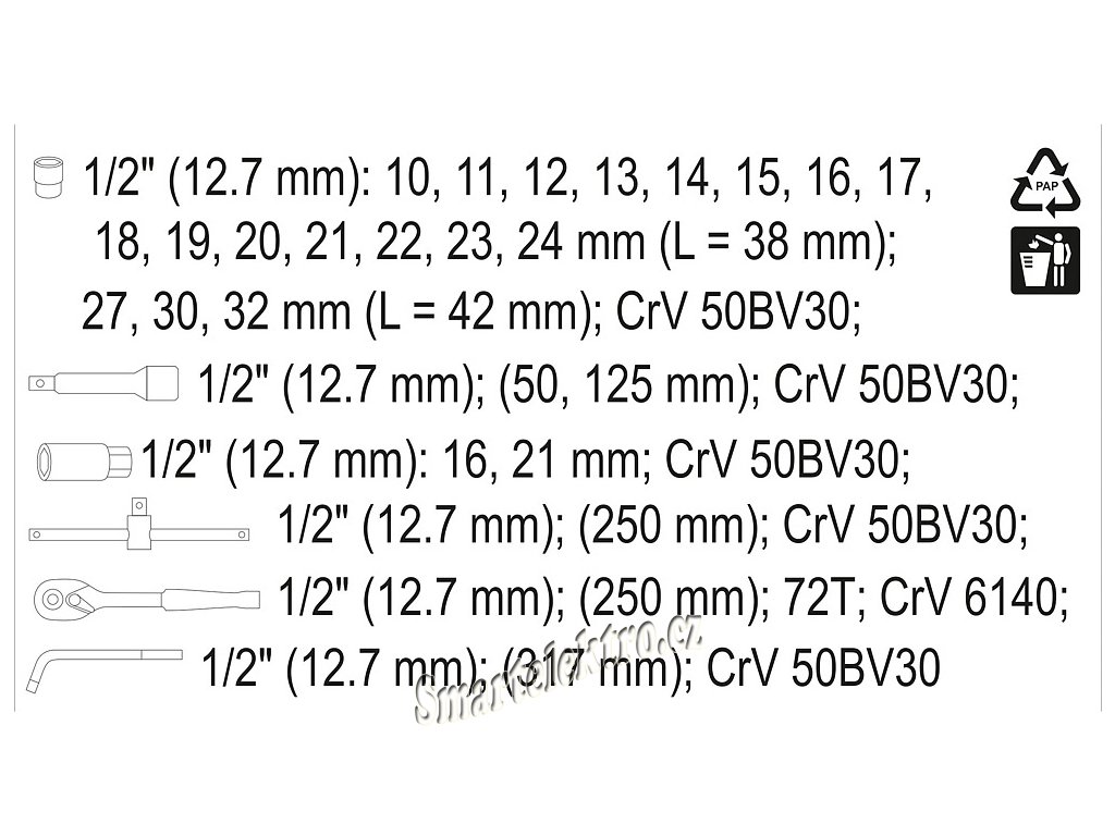 15x | nástavec 1/2": 10; 11; 12; 13; 14; 15; 16; 17; 18; 19; 20; 21; 22; 23; 24 mm (38 mm) |