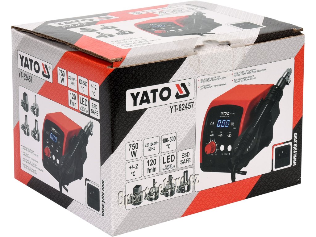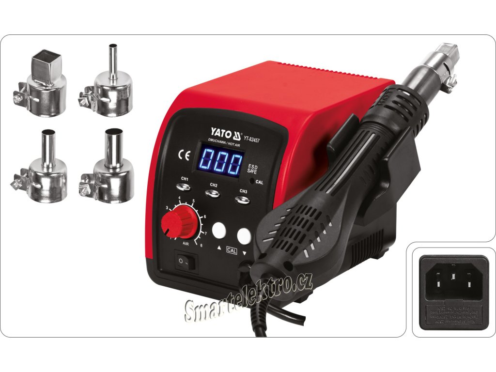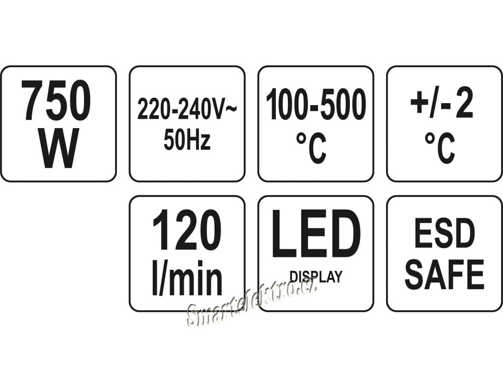 Horkovzdušnou pájku s keramickým ohřívačem s příkonem 750W a provozní teplotou 100-500°C je možné osadit jednou ze 4 přiložených trysek (3x kulatá, 1x hranatá). Na teplotu 350°C se zahřeje za zhruba 6 vteřin.