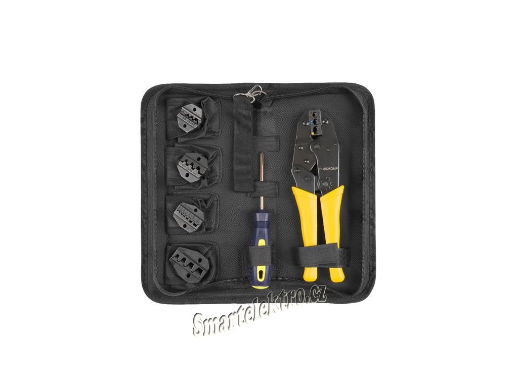 - Tato praktická sada je vhodná jako nástroj pro krimpování kabelových ok, konektorů a koncových spojů. 5 různých upínacích čelistí lze během okamžiku vyměnit díky přiloženému šroubováku. Sada je uložena v praktické tašce na nářadí.