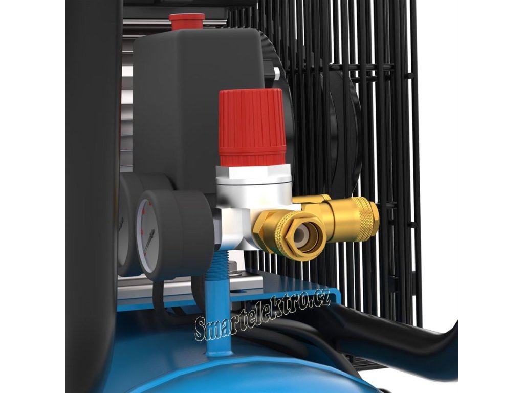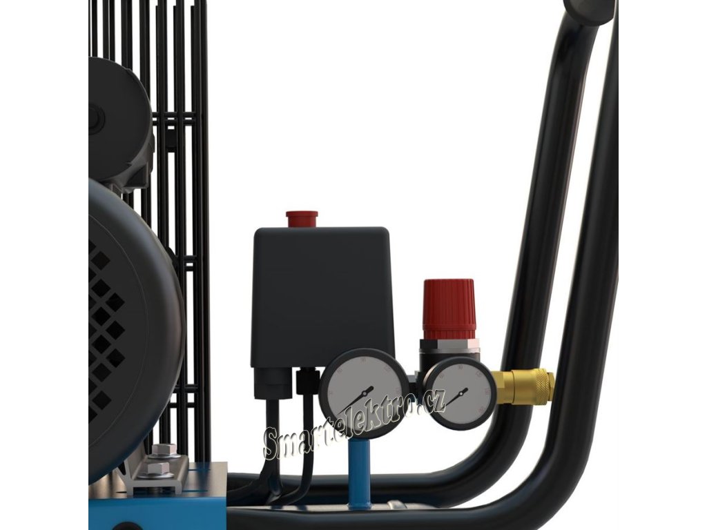 Vybavení - funkce • dvouválcový „V” agregát s olejovým mazáním • tlakový spínač • řemenový pohon • redukční ventil - snadné nastavení pracovního tlaku • manometr pro měření tlaku ve vzdušníku a pracovního tlaku • 2 pneumatické rychlospojky • pojistný ventil a zátka pro vypouštění kondenzátu • praktická přepravní rukojeť • plastová kola s gumovým povrchem |