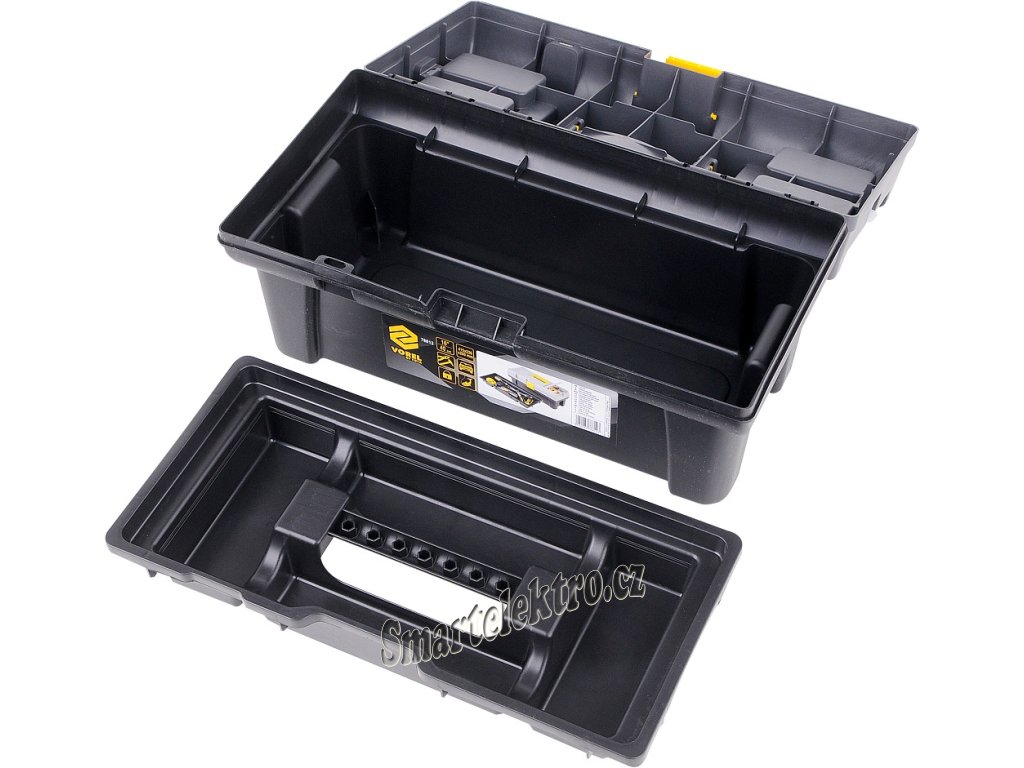 Plastový kufr se dvěma pevnými organizéry na víku a vnitřní vyjímatelnou vložkou na drobné předměty.