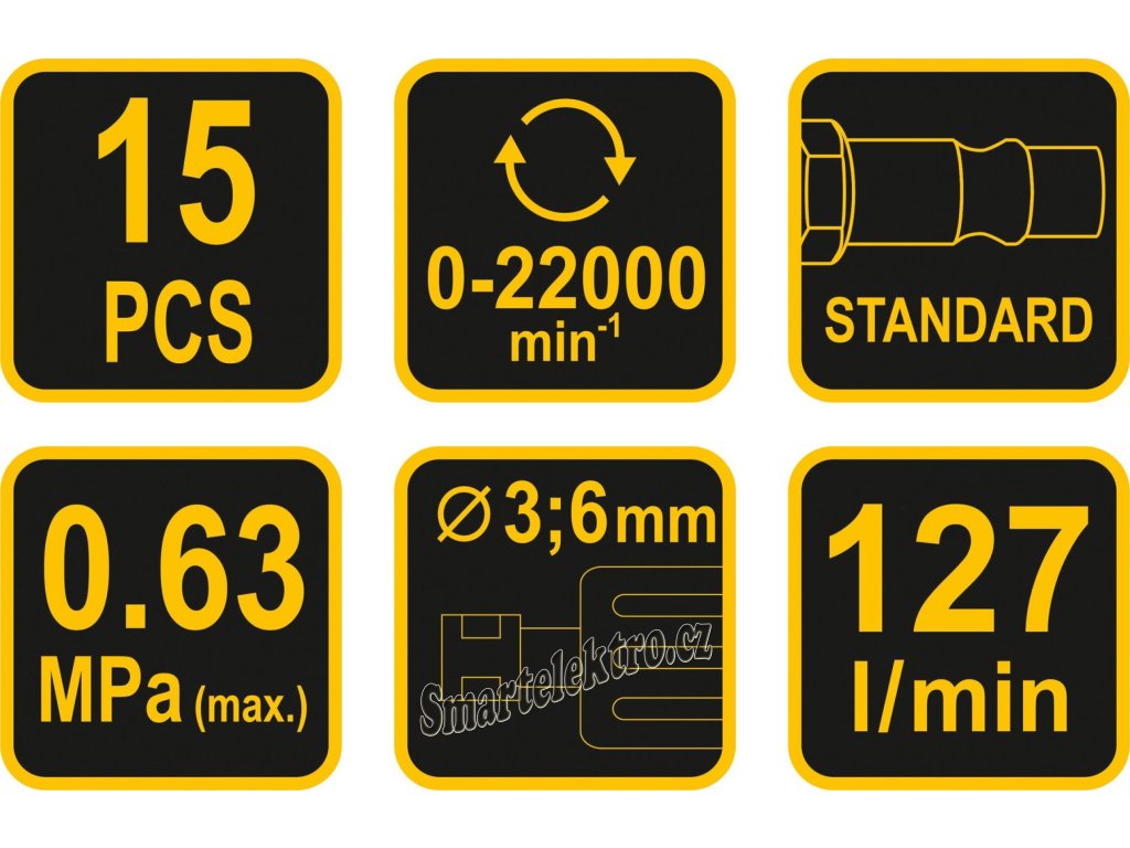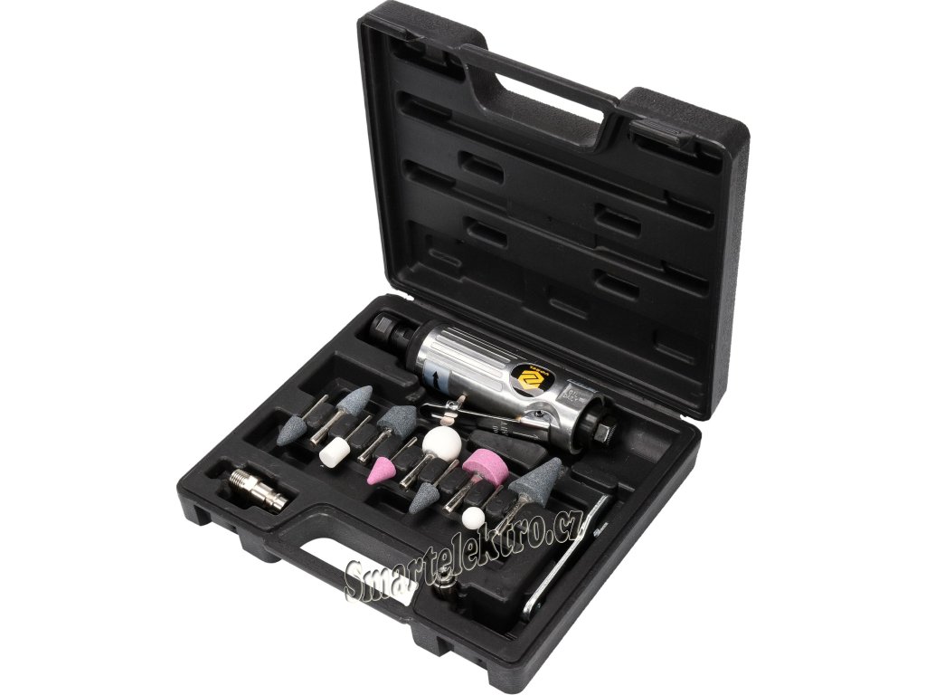 Sada pneumatické přímé brusky k připojení řezných a brusných nástrojů se stopkou průměru 6 mm.