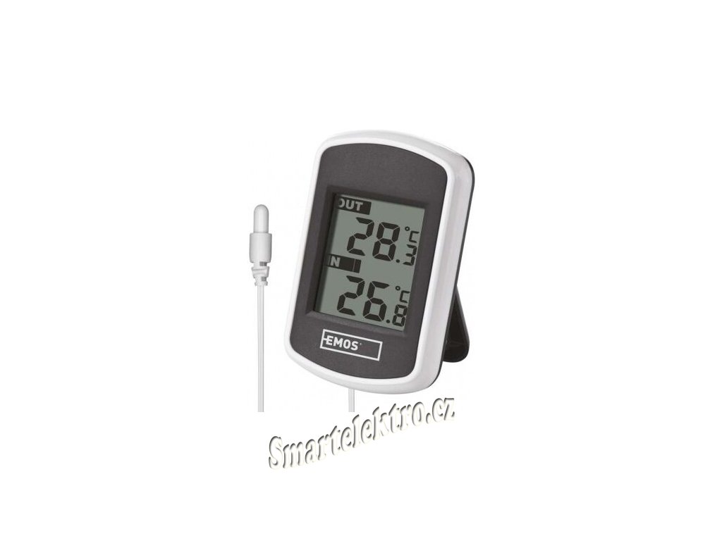 Digitální teploměr s drátovou sondou. Zaznamenává vnitřní a venkovní teplotu, min. a max. teplotu. Sonda má délku 0,9 m.