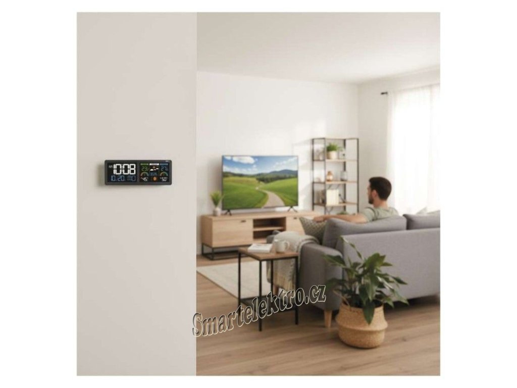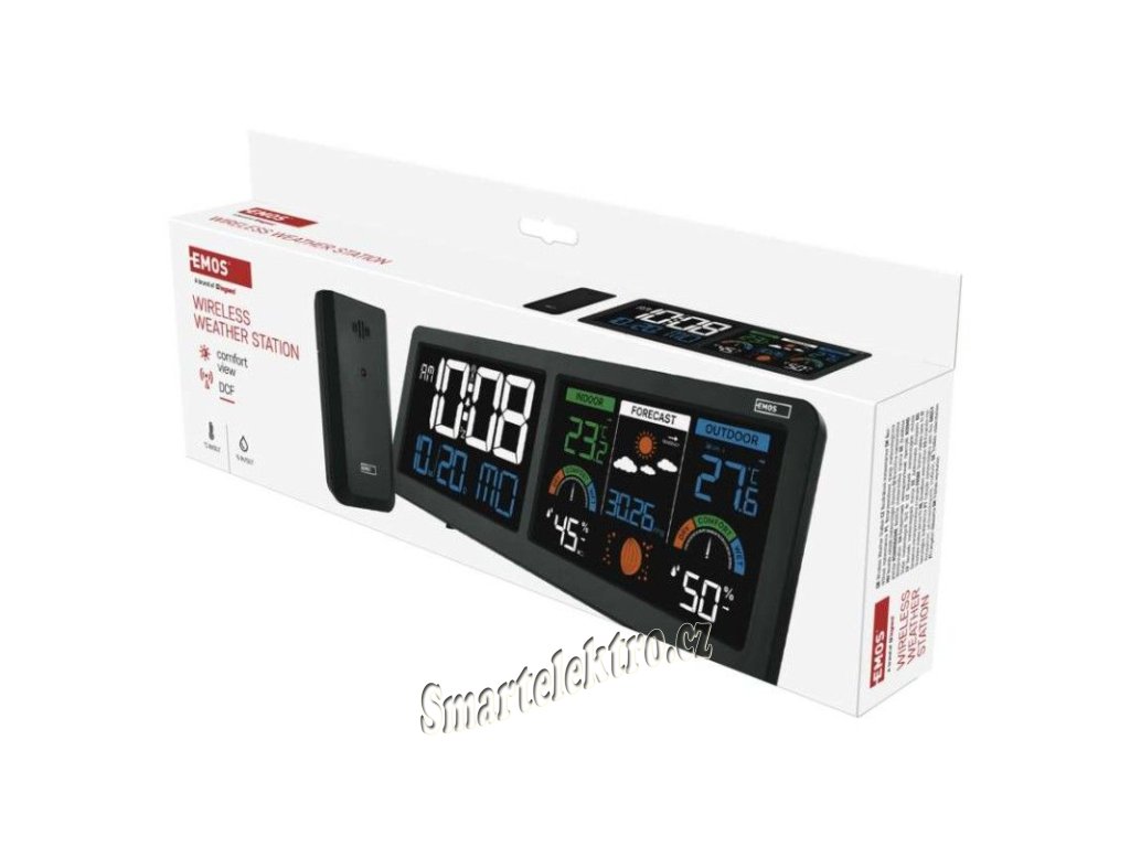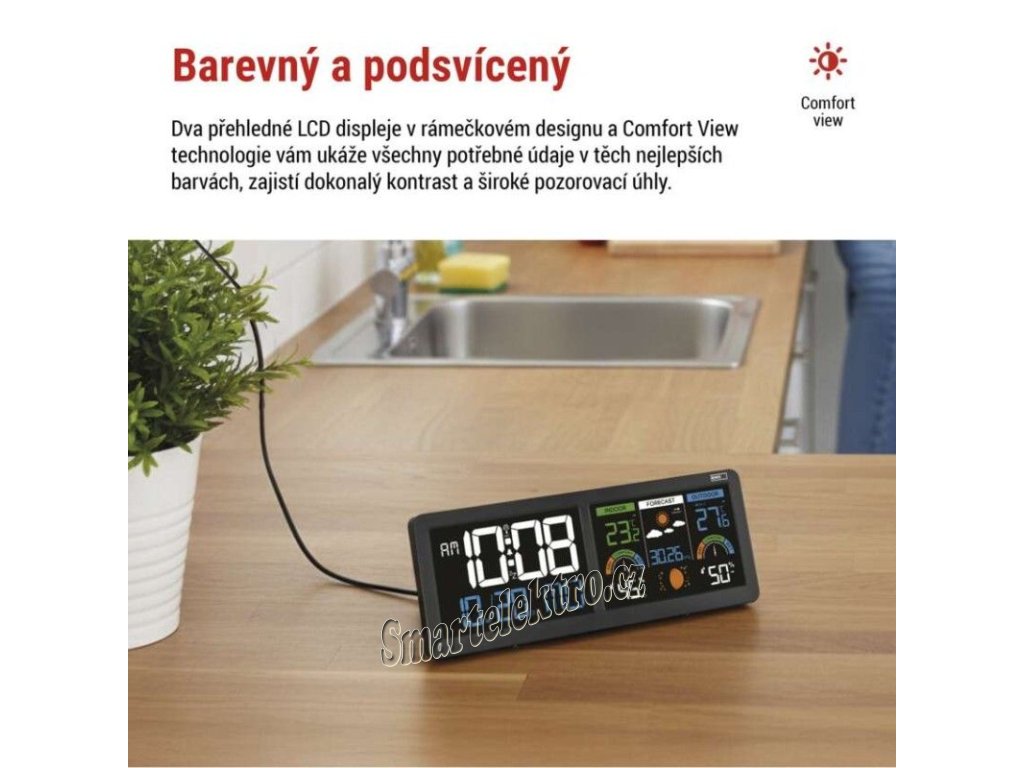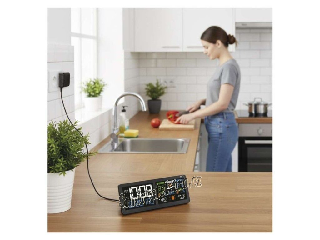 Představujeme novou moderní meteostanici, která promění každodenní sledování počasí v přehledný a elegantní zážitek. Díky měření vnitřní i venkovní teploty a vlhkosti máte vždy dokonalý přehled o klimatu ve svém okolí. Přehledná předpověď počasí spolu s detailním zobrazením 12 fází měsíce vám navíc poskytnou širší kontext pro plánování každého dne. Stanice je vybavena dvěma podsvícenými LCD displeji s funkcí Comfort View, která zajišťuje snadné čtení údajů ve dne i v noci. Vestavěné hodiny řízené DCF signálem se samy postarají o přesnost času. Samozřejmostí je budík s funkcí Snooze, barometr, ukazatel komfortu, trend teploty, záznam minimálních a maximálních hodnot, nastavitelné teplotní limity, stejně jako datum, čas a kalendář – vše přehledně na jednom místě.