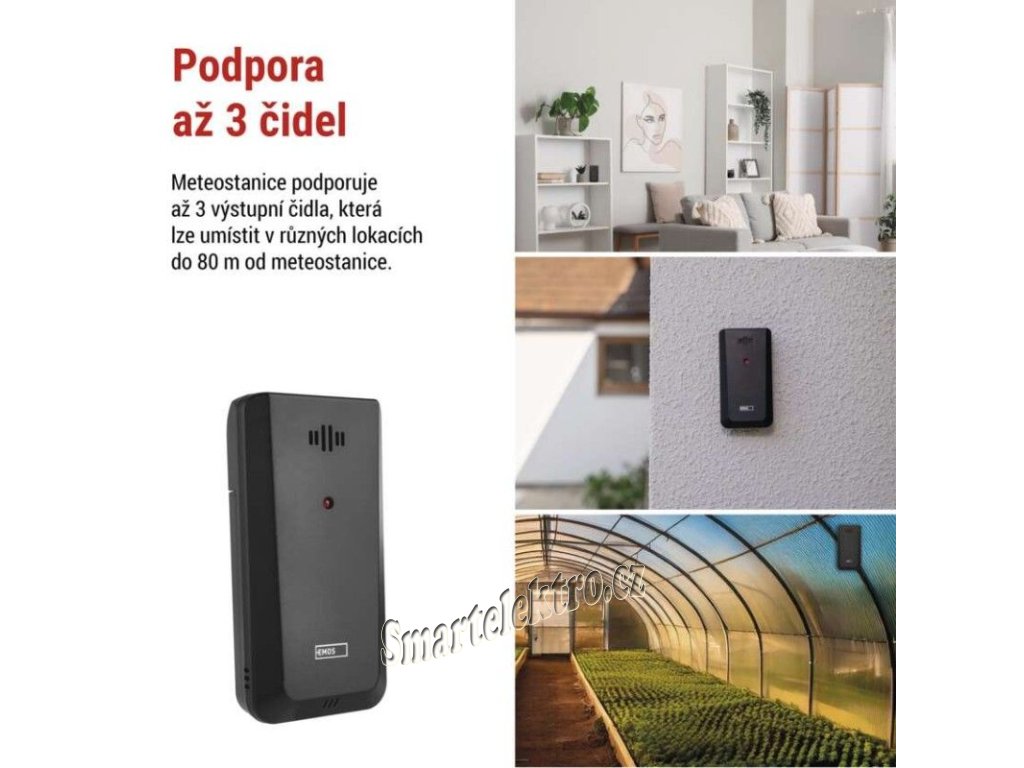 Externí čidla napájená 2× 1,5 V AAA bateriemi lze podle potřeby umístit v interiéru i exteriéru. V balení je jedno externí čidlo, přičemž meteostanici lze rozšířit až o další dvě kompatibilní čidla (E05018), dostupná na našich webových stránkách. Meteostanice nabízí vysoce přesné měření s jemným rozlišením 0,1 °C. Vnitřní teplotu sleduje v rozsahu 0 °C až +50 °C, venkovní teplotu pak v širokém rozsahu −40 °C až +70 °C, takže vás spolehlivě informuje i v extrémních podmínkách.