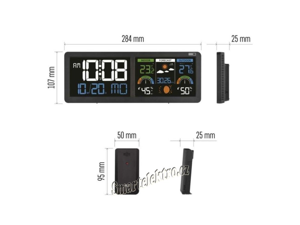 Levý displej přehledně zobrazuje aktuální čas, datum a název dne, zatímco pravý displej soustřeďuje všechny důležité meteorologické informace – předpověď počasí, vnitřní i venkovní teplotu a vlhkost, barometr, fázi měsíce, ukazatele komfortu a další praktické údaje. Vše je uspořádáno tak, abyste měli dokonalý přehled na první pohled.