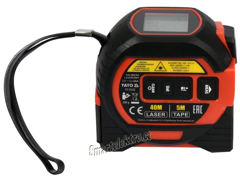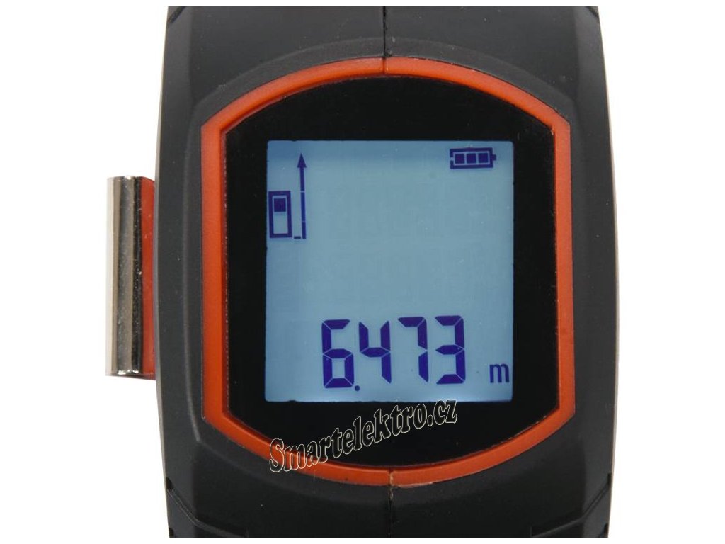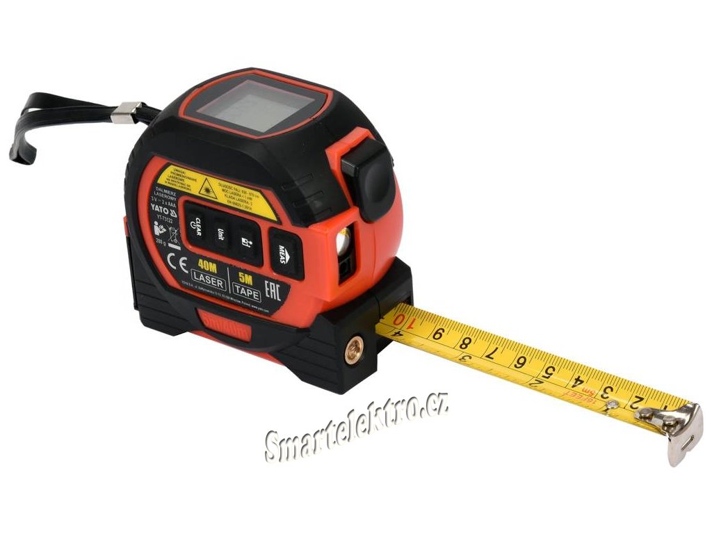 Svinovací metr s ocelovou páskou 5 m x 19 mm a laserovým dálkoměrem s rozsahem měření 0,2 až 40 m Má také funkční křížový laser, který se zapne po krátkém stisku spínače (cca 3 sec.).