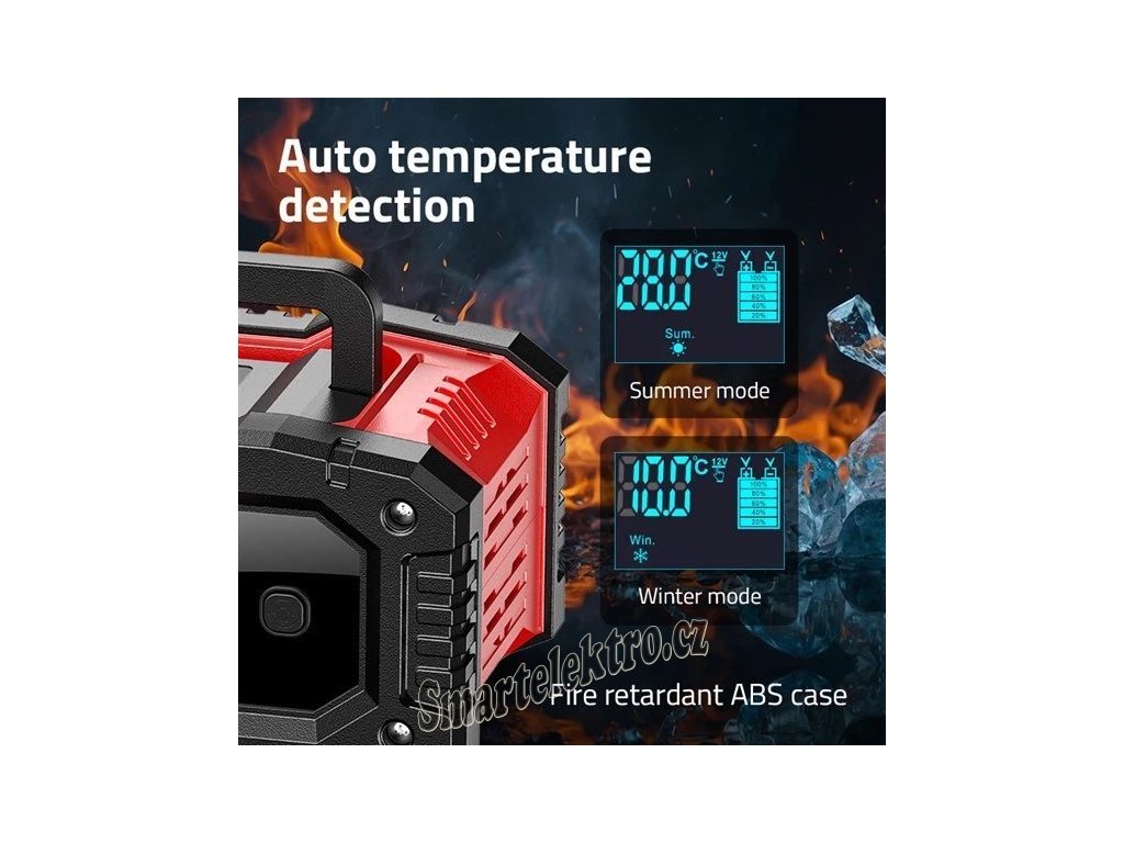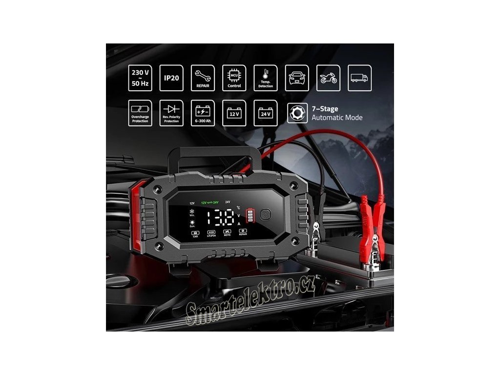 - nabíječka má celkem 7 módů: 12V AGM + (LiFePO4) , 24V AGM + (LiFePO4) , 12V auto, 24V auto, 12V motocykl, 24V motocykl, oprava