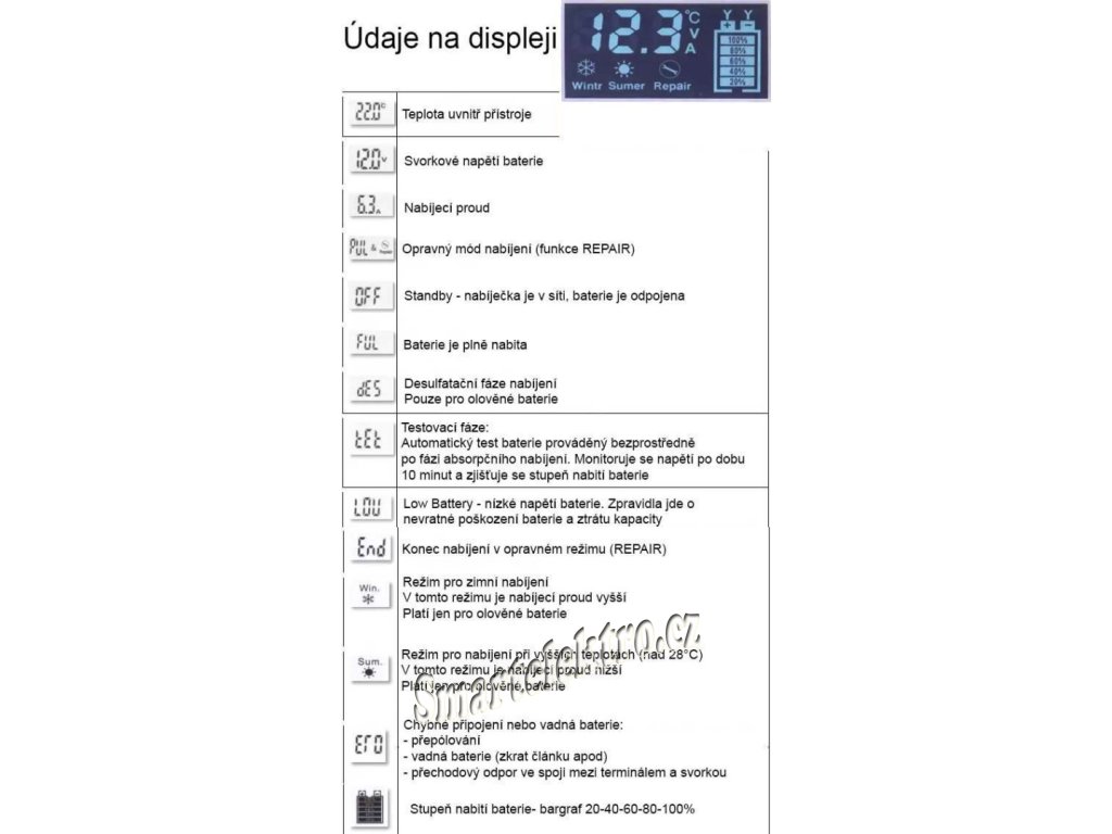 * Automatická nabíječka Pb baterií proudem do 7A umožňující trvalé propojení s nabíjenou baterií. Je vybavená programem pro regeneraci baterií a volbou druhu baterie (AGM, AGM GEL,STANDARD,MOTO).