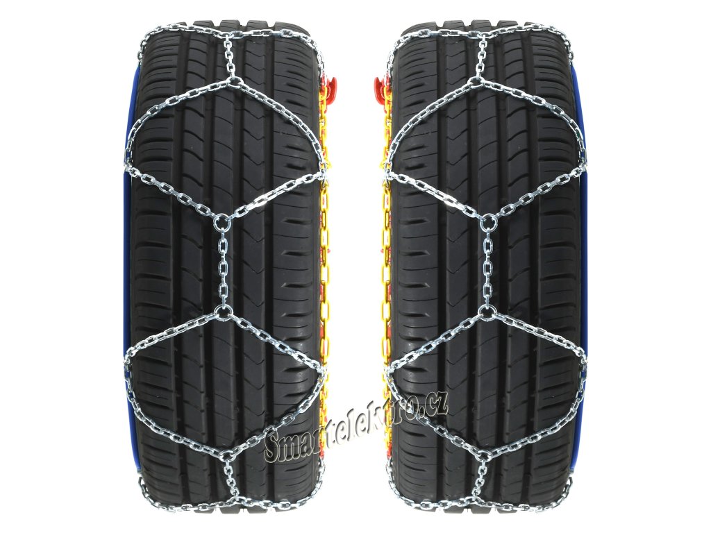 Rychloupínací sněhové řetězy, křížová stopa, sada 2kusy. Určeno pro vozy do hmotnosti 2000kg. Homologace GS TÜV, očko řetězu 3mm, 9mm. Baleno v praktické uzavíratelné textilní...