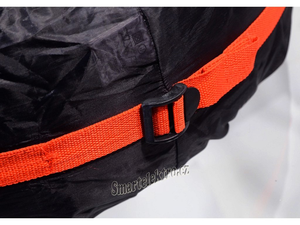Návlek se nasune na pneumatiku a pomocí popruhu se sponou se důkladně upne po obvodu. Po stranách jsou umístěny gumové upínáky pro dokonalé obepnutí pneumatik.