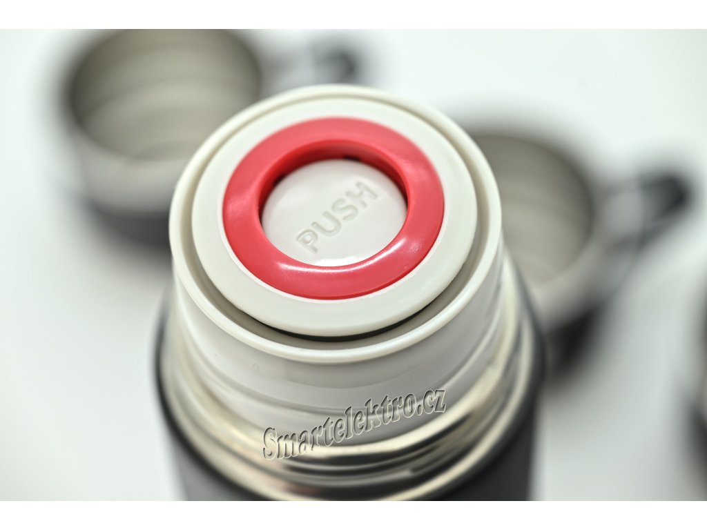 Vrchní část termosky je opatřena těsnícím víčkem s tlačítkem pro snadné nalévání, víčko lze navíc zakrýt jedním ze šálků.