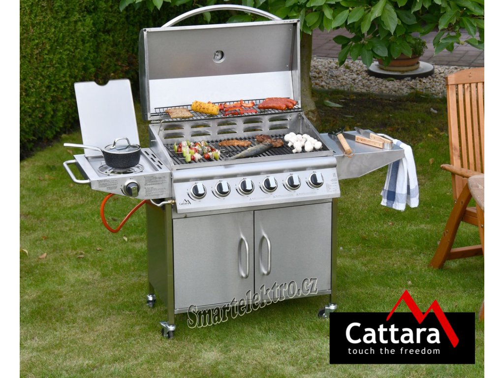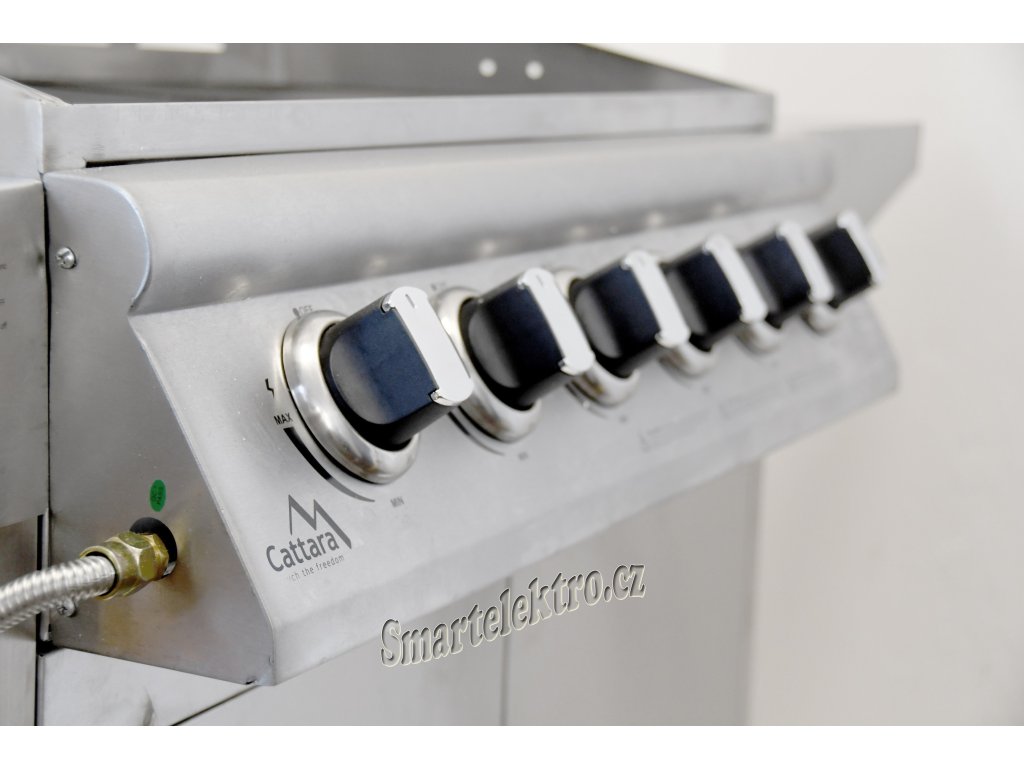 Nerezový plynový gril G21 California BBQ Premium Line s litinovým roštem, litinovým plátem, elektrickým zapalováním, plynovou regulací, s bočním hořákem o výkonu 3,15 kW a 3...