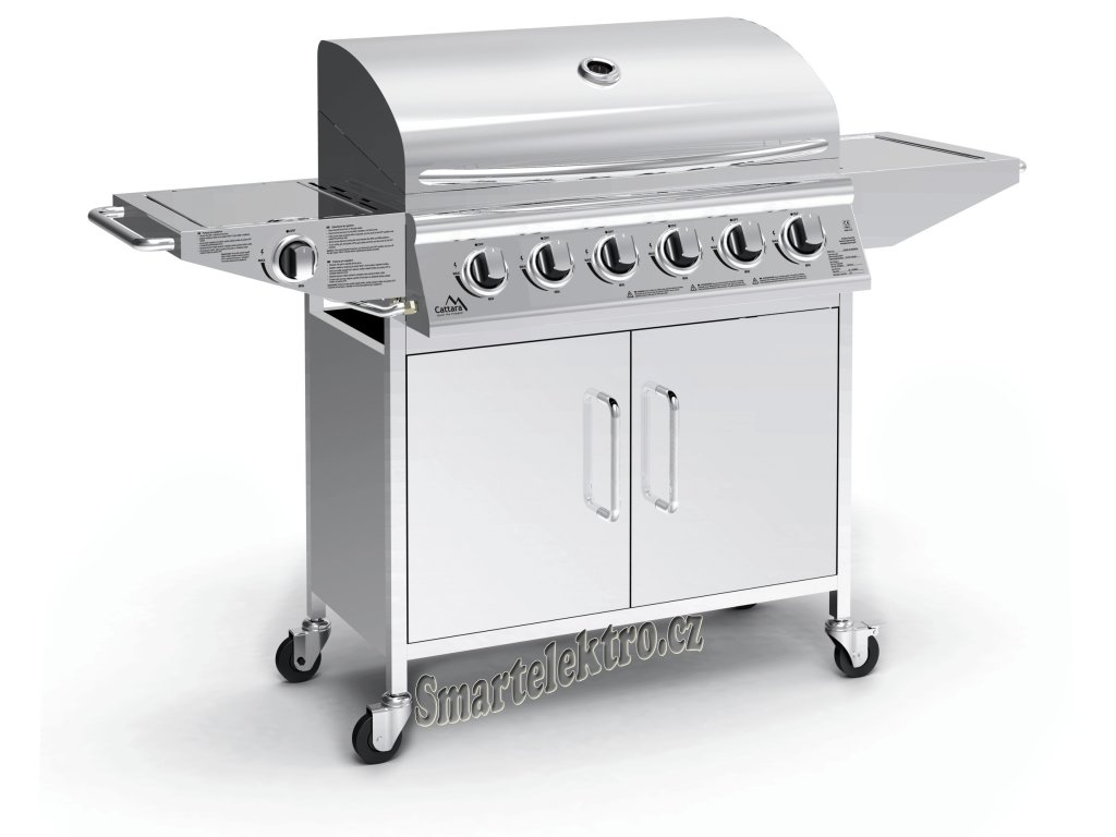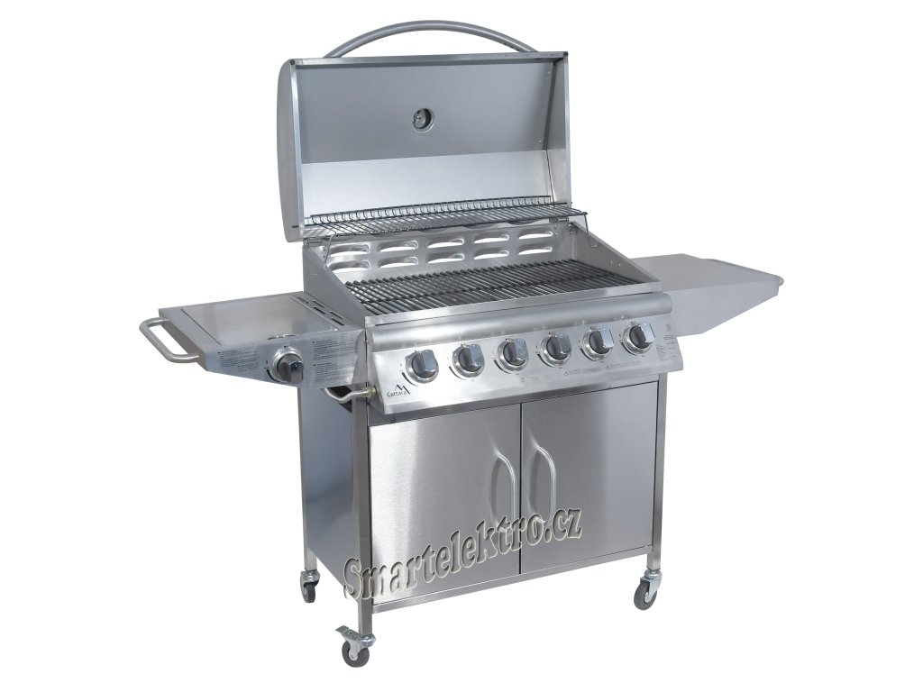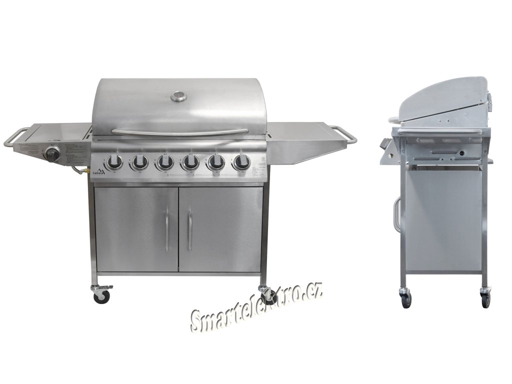 Nerezový plynový gril G21 Arizona BBQ na kuře, steak či na gyros, grilovací jehla s motorem. Gril s litinovým roštem a bočním hořákem, dohromady 6 hořáků (6 x 4 kW), systém...