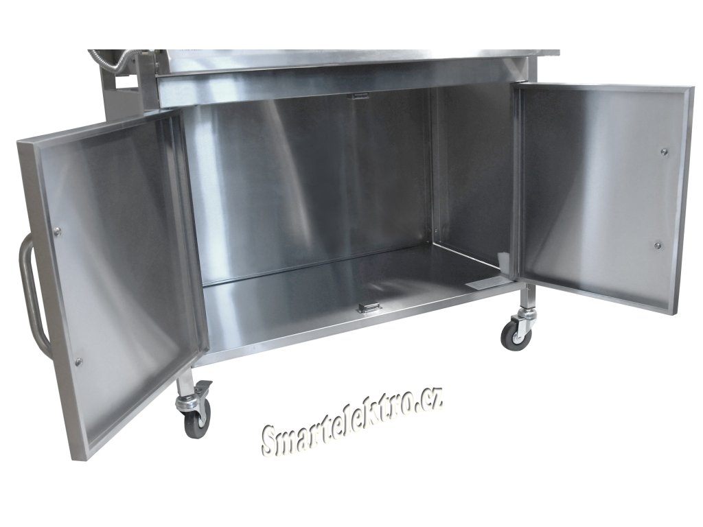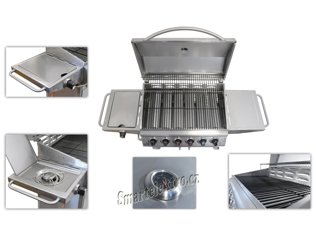 Gril je pojízdný (4 kolečka z toho 2 bržděná), osazen sklopným víkem s teploměrem a odkládací poličkou na příslušenství. Dále byl doplněn bočním vařičem se samostatnou regulací a piezo zapalováním. Ve střední části je objemná, uzavíratelná skříňka s dvířky. Součástí je i spojovací hadice k plynové lahvi a redukční ventil.