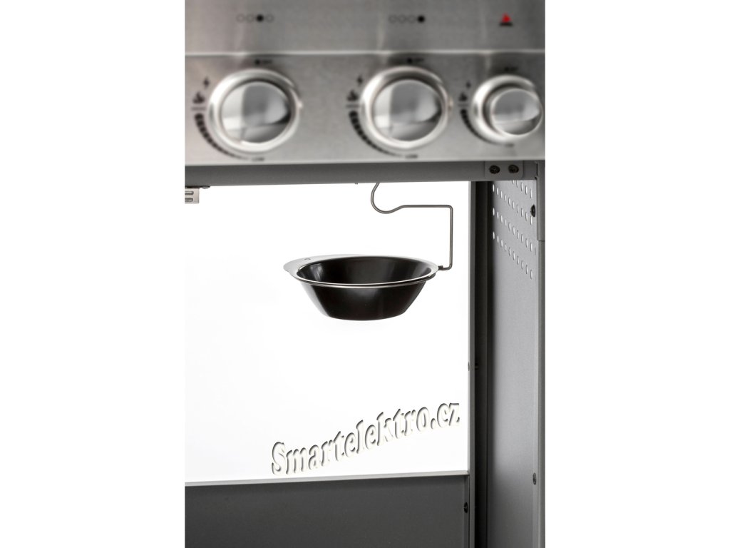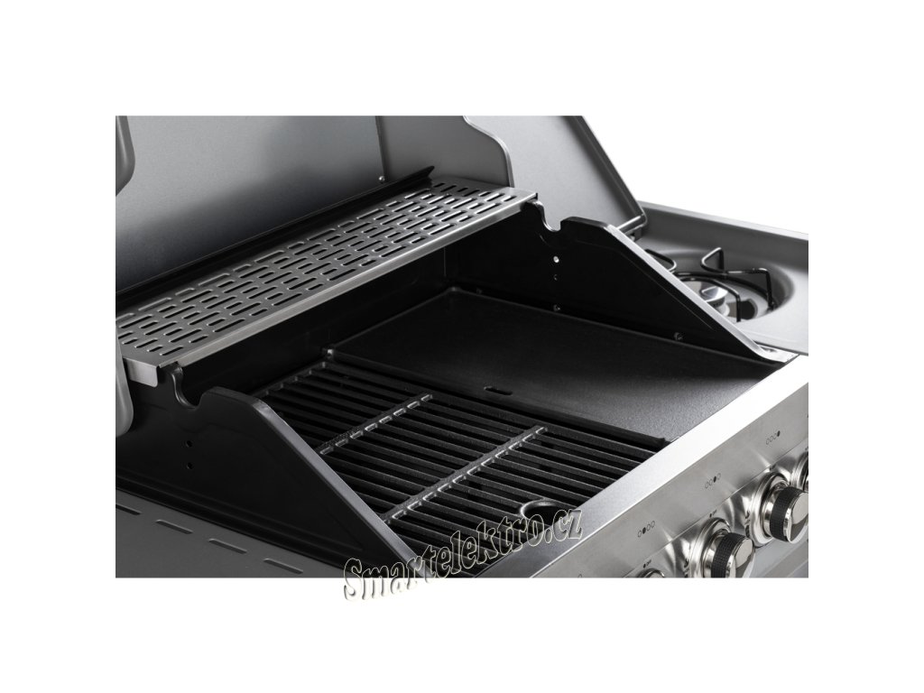 Plynový zahradní gril se systémem Flame Tamer - nevyžaduje lávové kameny. Trojitý hlavní a jeden boční nerezový hořák s piezo zapalováním a plynulou regulací.
