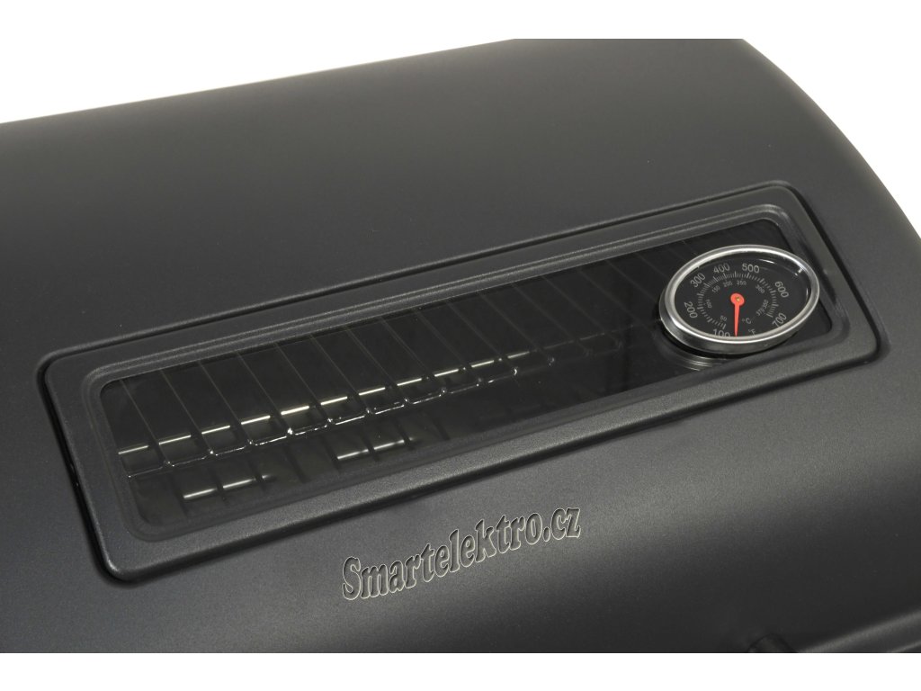 Sklopné víko grilu je opatřeno průzorem, díky kterému je možné sledovat stav grilovaných pokrmů bez otevírání grilu. Gril je pojízdný (2 kolečka), je dále vybaven odkládacími poličkami na obou stranách. Součástí je i spojovací hadice k plynové lahvi a redukční ventil.