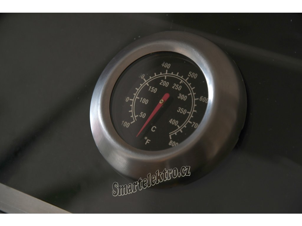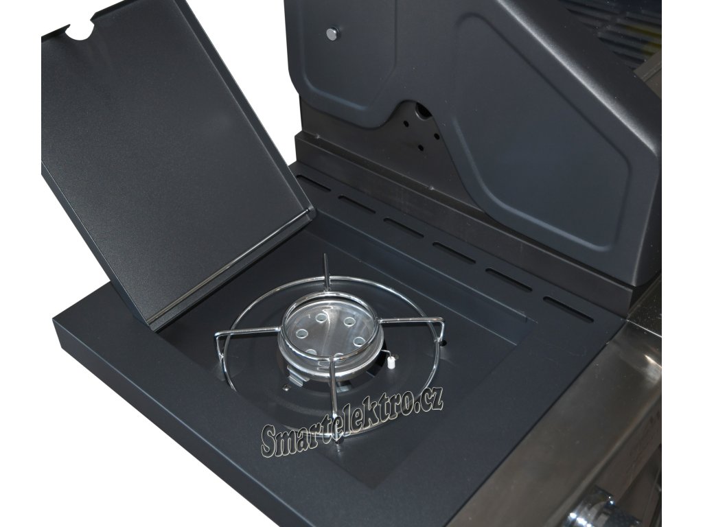 Sklopné víko grilu je opatřeno průzorem, díky kterému je možné sledovat stav grilovaných pokrmů bez otevírání grilu. Gril je vybaven odkládacími poličkami na obou stranách, z nichž jedna je doplněna o boční vařič. Součástí je i spojovací hadice k plynové lahvi a redukční ventil.