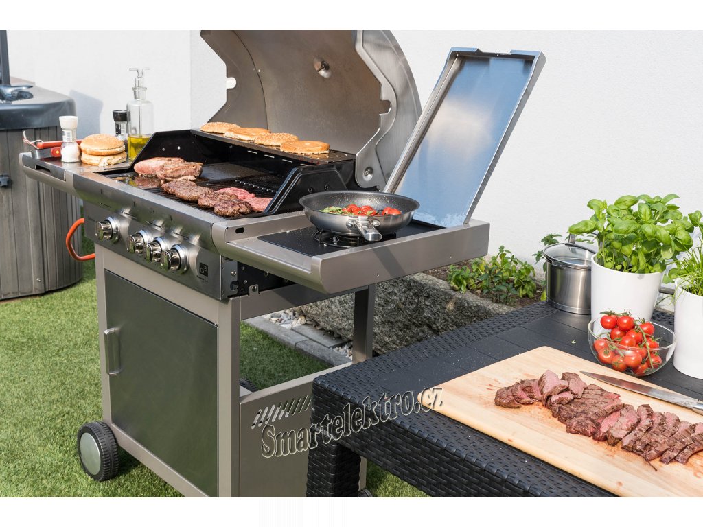 Zahradní plynový gril je opatřen odklápěcím krytem grilovací plochy a odkládacími poličkami na obou stranách. Pod levou odkládací plochou se skrývá nádobka, kam můžete odkládat např. naložené maso připravené ke grilování. Pod pravou odkládací plochou se nachází boční hořák. Gril je vyrobený z kvalitního nerezu.