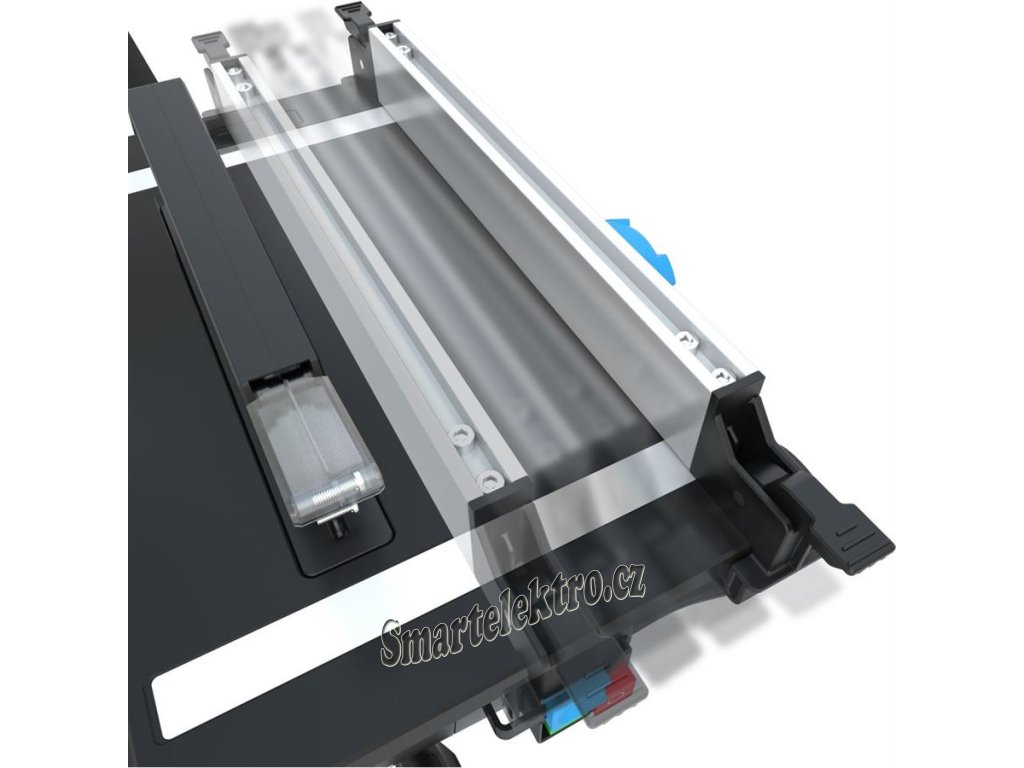 Paralelní doraz, úhlový doraz, posuvná tyč, přípojka pro odsávací zařízení.