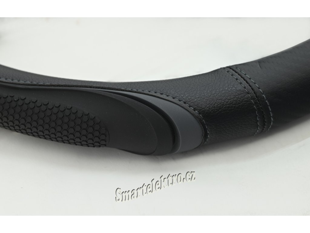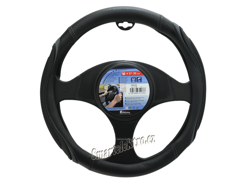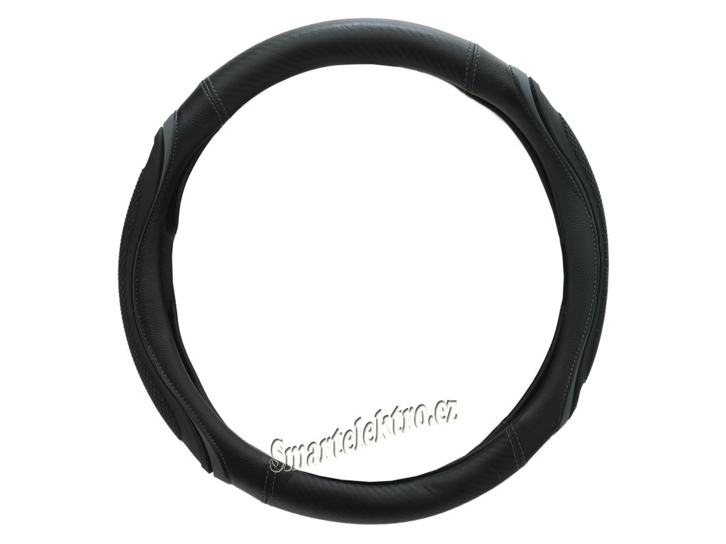 Potah určený k nasazení na volant o průměru 37-39cm.Černé provedení s šedými doplňky a s elegantním vším šedých nití.