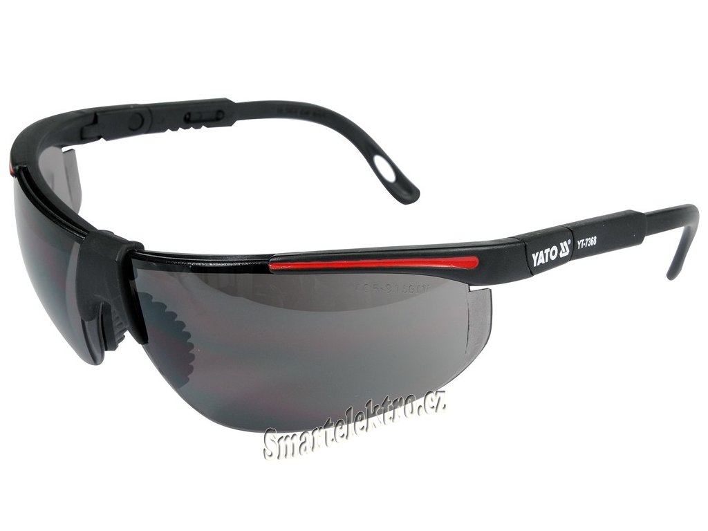 Tmavé ochranné brýle z polykarbonátu, s délkově nastavitelnými ramínky, které lze navíc pomocí otvorů na koncích opatřit např. gumičkou pro zavěšení na krk.