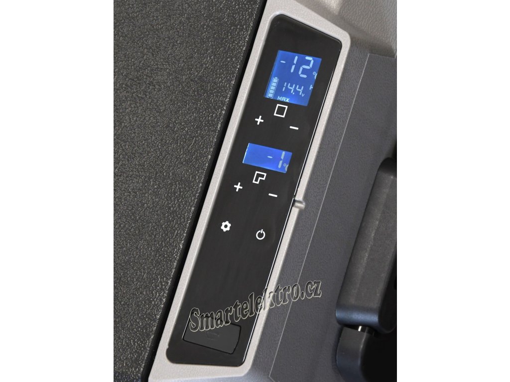 Dále je box vybaven inteligentním systémem ochrany před vybitím připojeného akumulátoru, který lze nastavit skrze menu přístroje. Chladící box je osazen displejem s veškerými ovládacími prvky.