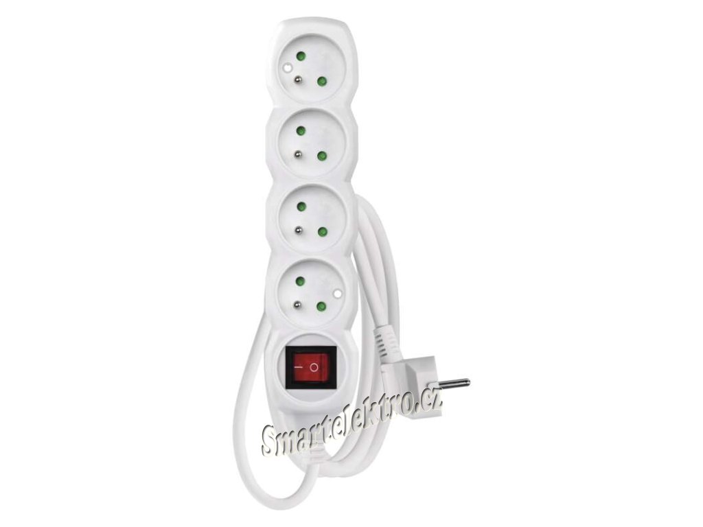 Bílý prodlužovací přívod, 5 zásuvka s vypínačem, délkou 5 m a průřezem vodiče 1 mm2.