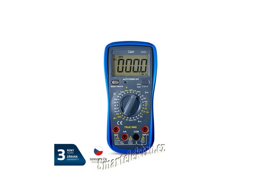 Multimetr GETI GM50C je profesionální přístroj vhodný k měření široké škály elektrických veličin jako jsou: napětí (DCV a ACV), proud (DCA a ACA), odpor, kapacita a další.