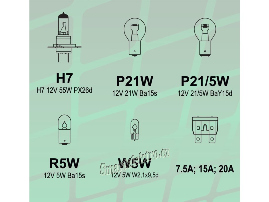 Sada je složena z nejběžnějších nožových pojistek a 12V žárovek.