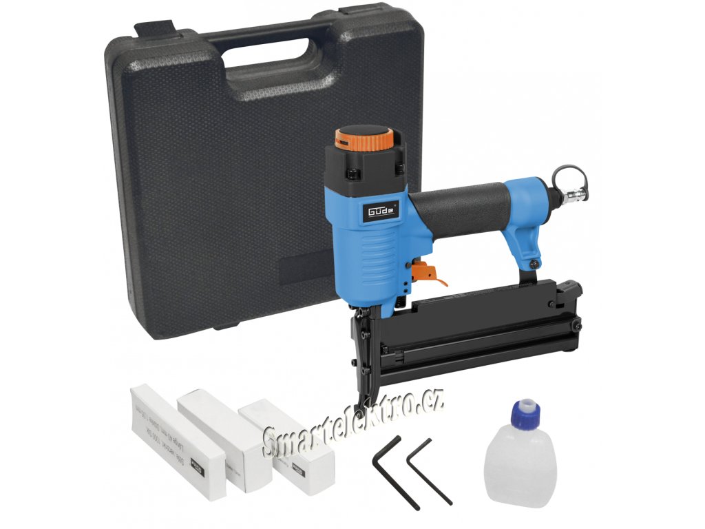 Konstrukce: rukojeť s měkkou (protiskluzovou) vložkou, výsuvný zásobník, vsuvka ¼“. Složení sady: balení 20 mm spon (200 ks), 25 mm hřebíků s hlavičkou 2 mm (500 ks) a 3 mm (100 ks), olejnička, plastový transportní kufřík.