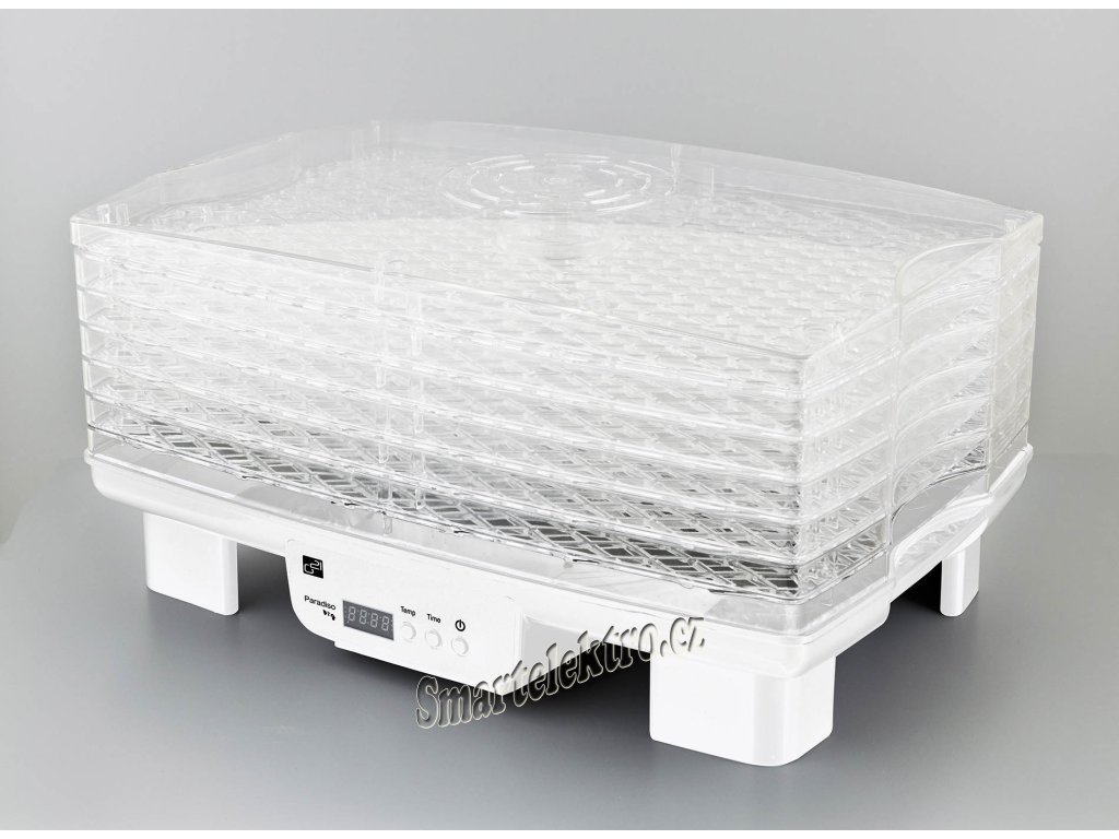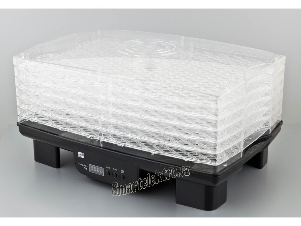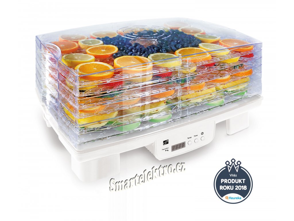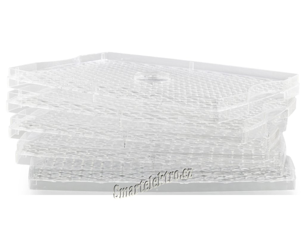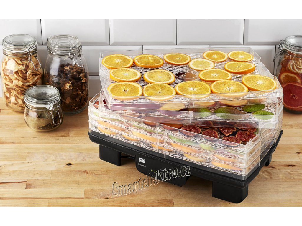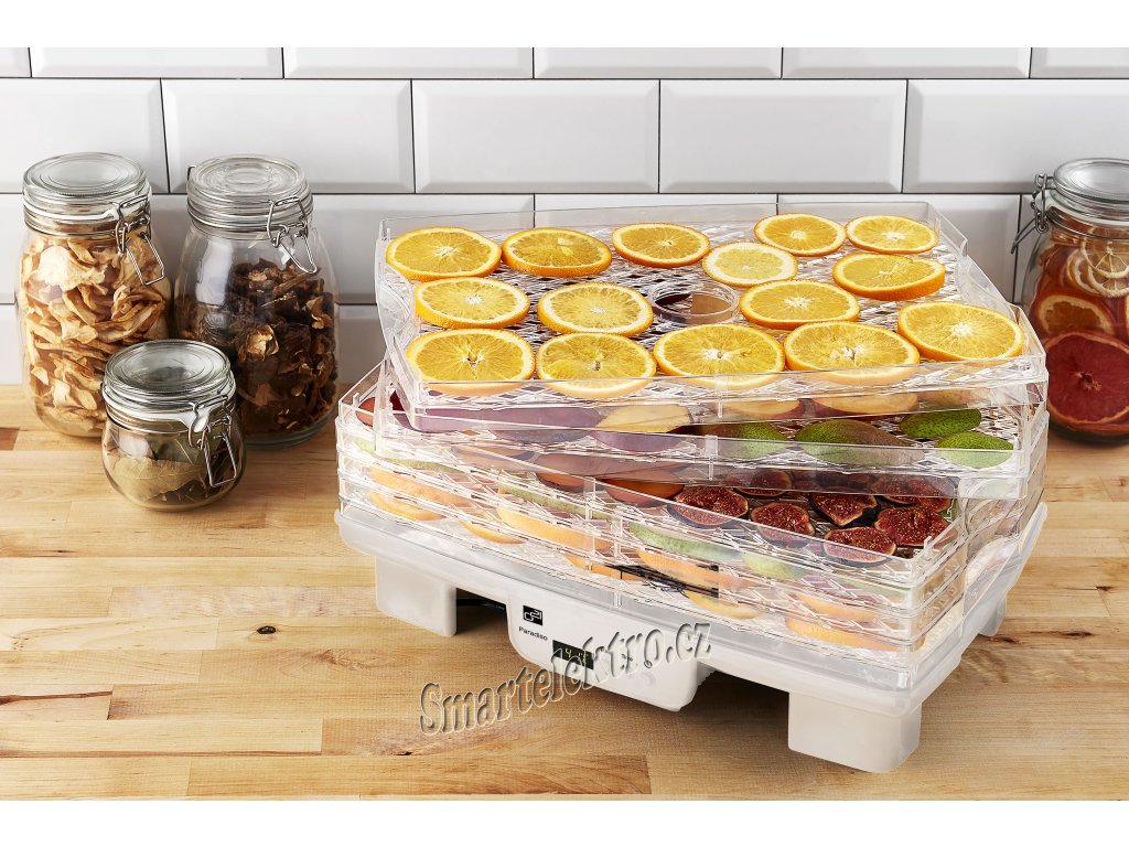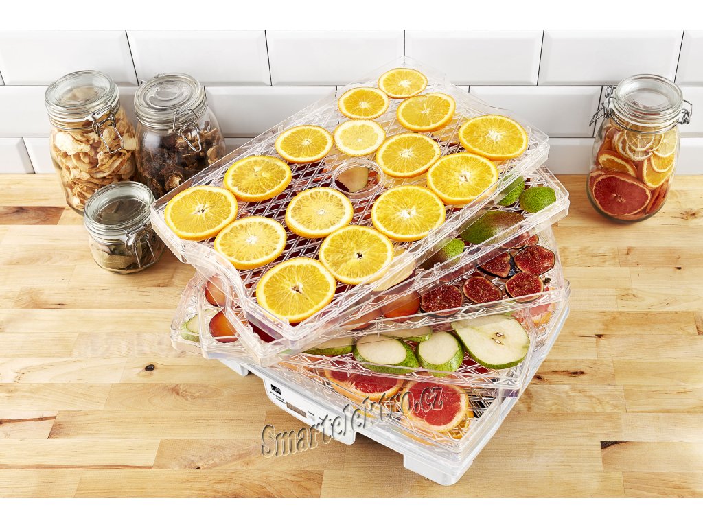 Usazení ventilátoru, výborně řešená sušící plata a navíc možnost jejich výškového nastavení garantuje rovnoměrné a rychlé sušení. Materiál sušících plat vám zase dopřeje jednoduché vyndání usušeného ovoce i zeleniny. Suroviny k platům nepřilnou, snadno je proto oddělíte.