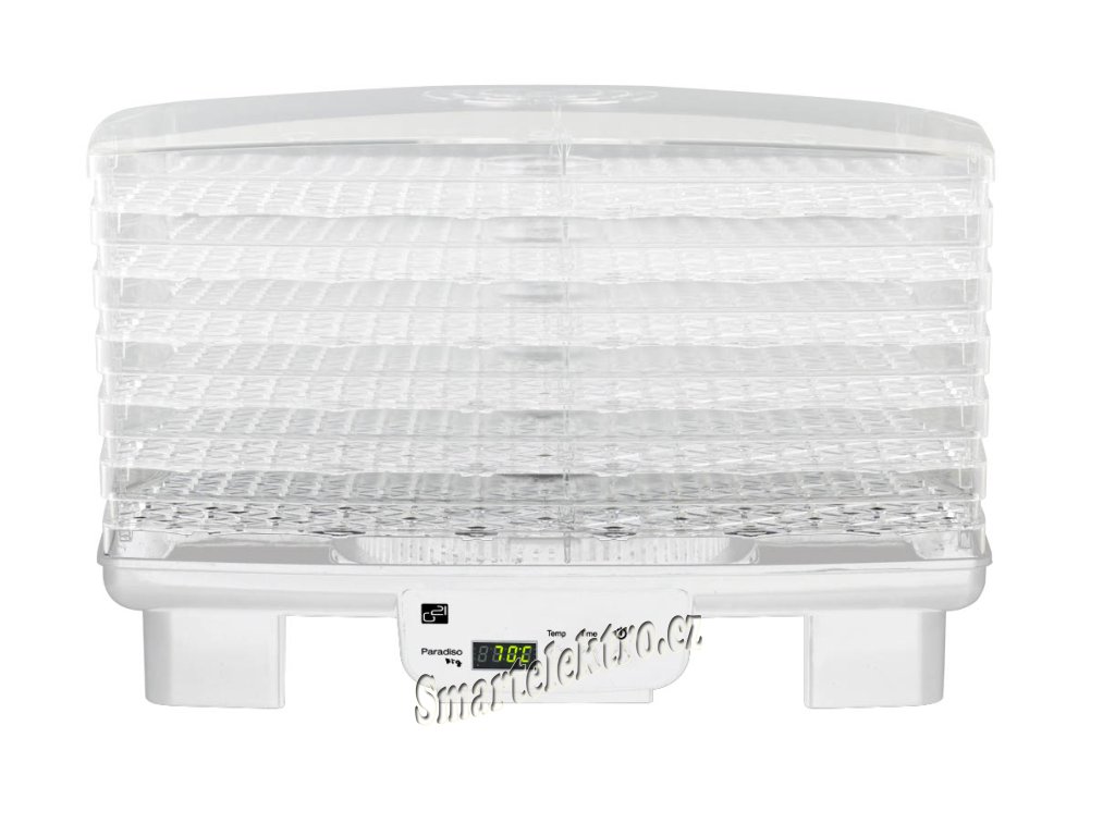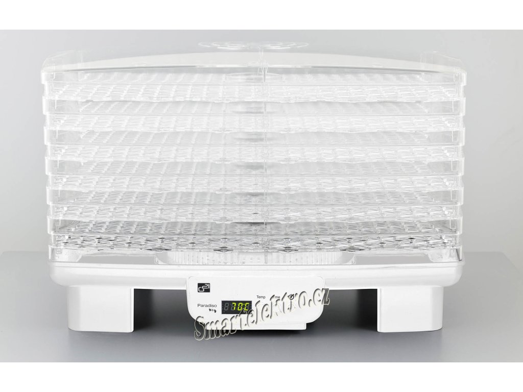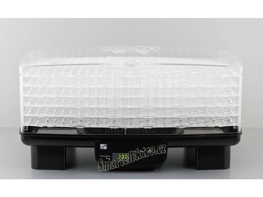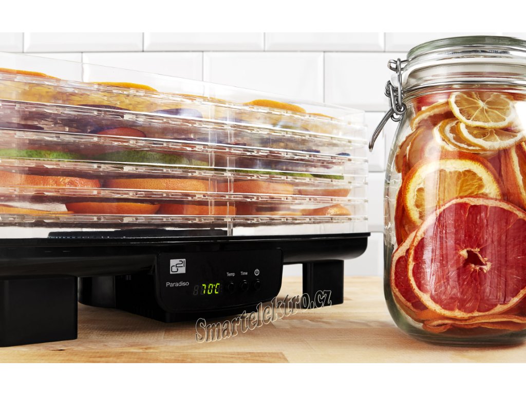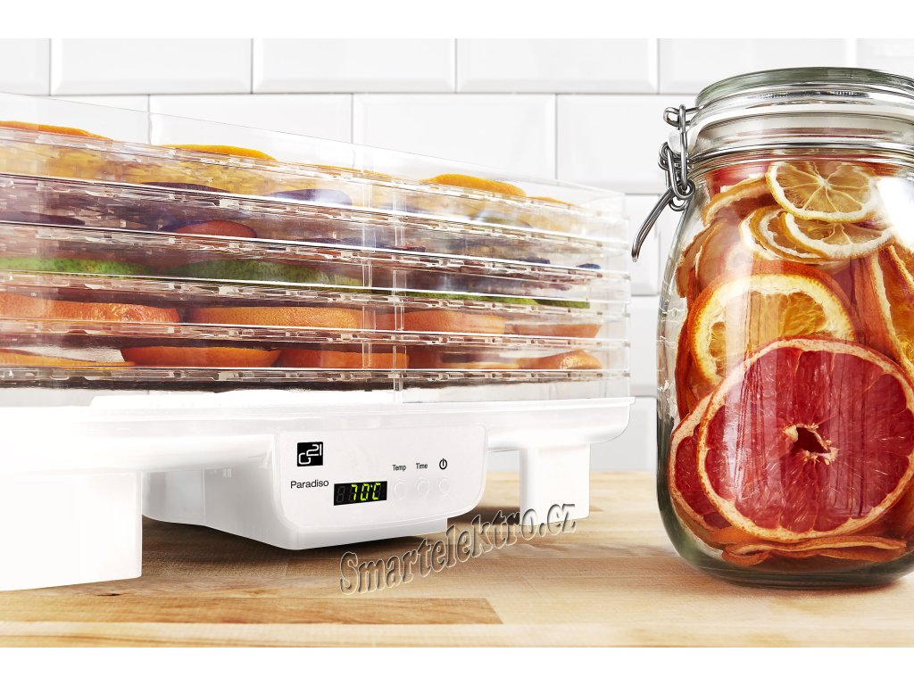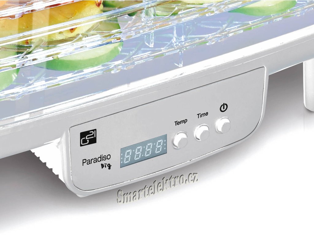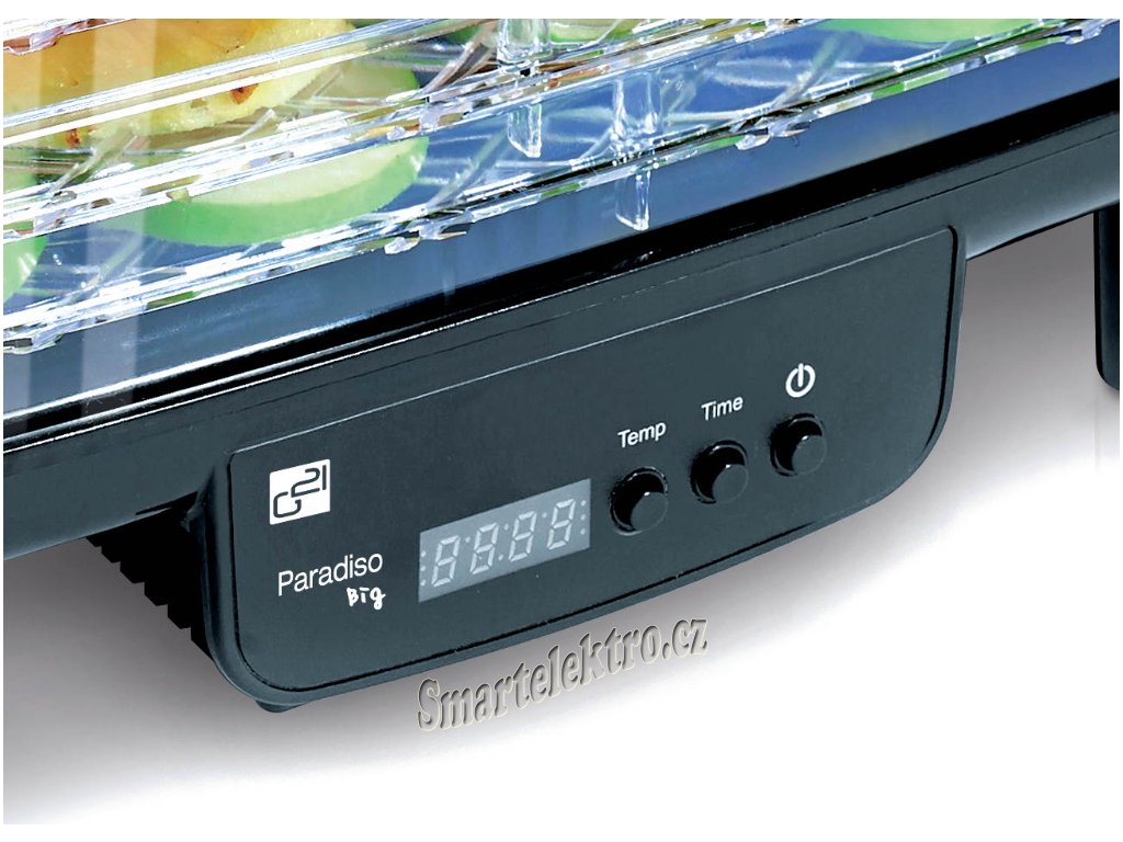 Teplotu sušení můžete zvolit v rozpětí od 40 do 70 °C. Doporučenou dobu sušení nastavíte na časovači, který díky funkci “automatické vypnutí” sušičku po stanovené době sám vypne. Nastavení i zbývající čas sušení můžete sledovat na digitálním displeji. Ovládání je proto velmi snadné a pohodlné. Sušičku G21 Paradiso Big skutečně hlídat nemusíte. Dělá to, co má. Suší.