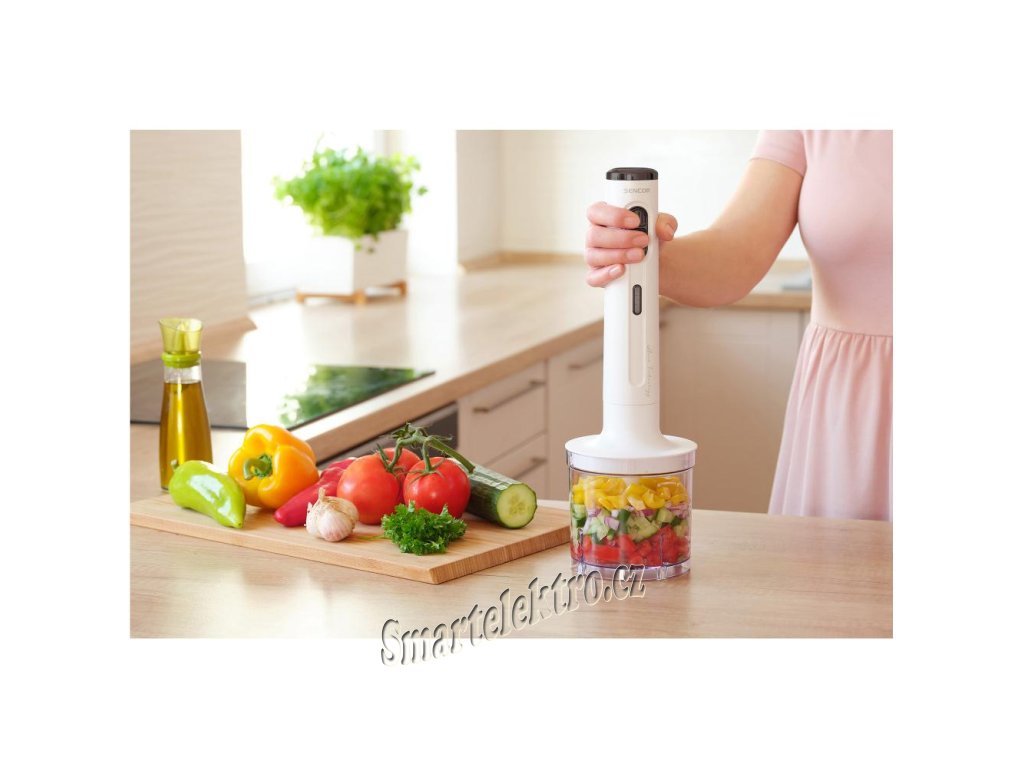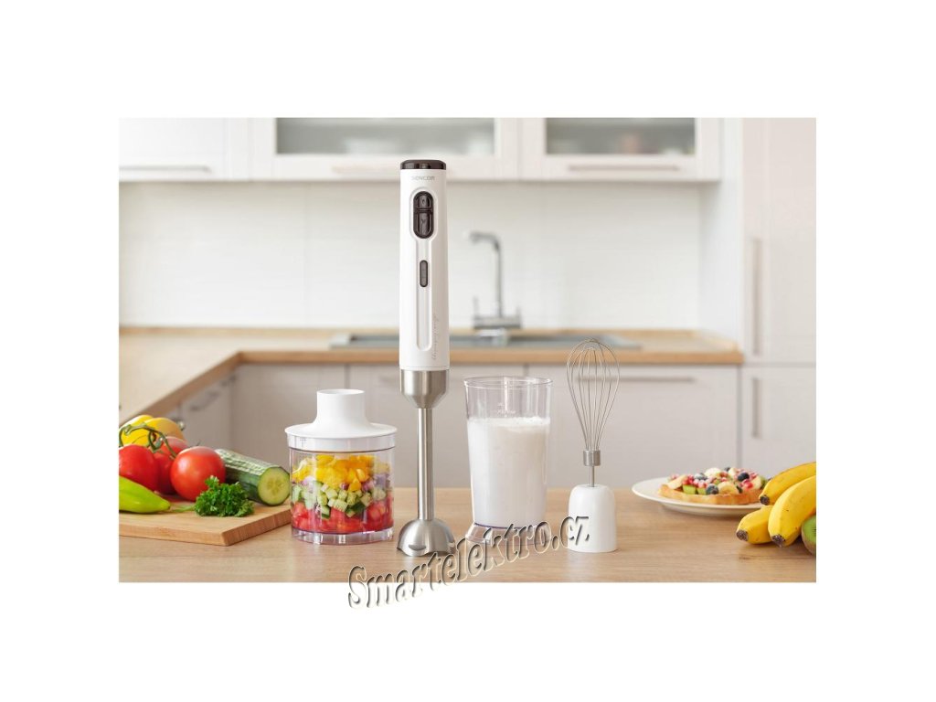 Aku tyčový mixér Sencor SHB 9000WH - 2 rychlosti, funkce sekání, šlehání a mixování, sekáček se sekací nádobou, mixovací nádoba a šlehací metla součástí balení,...