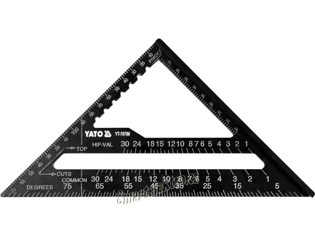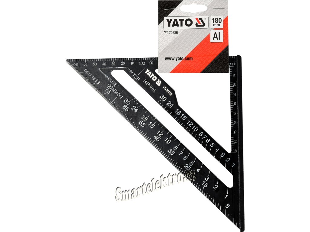 Tesařský hliníkový trojúhelník 180 mm s patkou. Je vyroben z hliníkové slitiny s lakovaným povrchem, trvale nanesená milimetrová i palcová stupnice a specializované úhlové stupnice určené pro měření prováděná při tesařských a pokrývačských pracích.