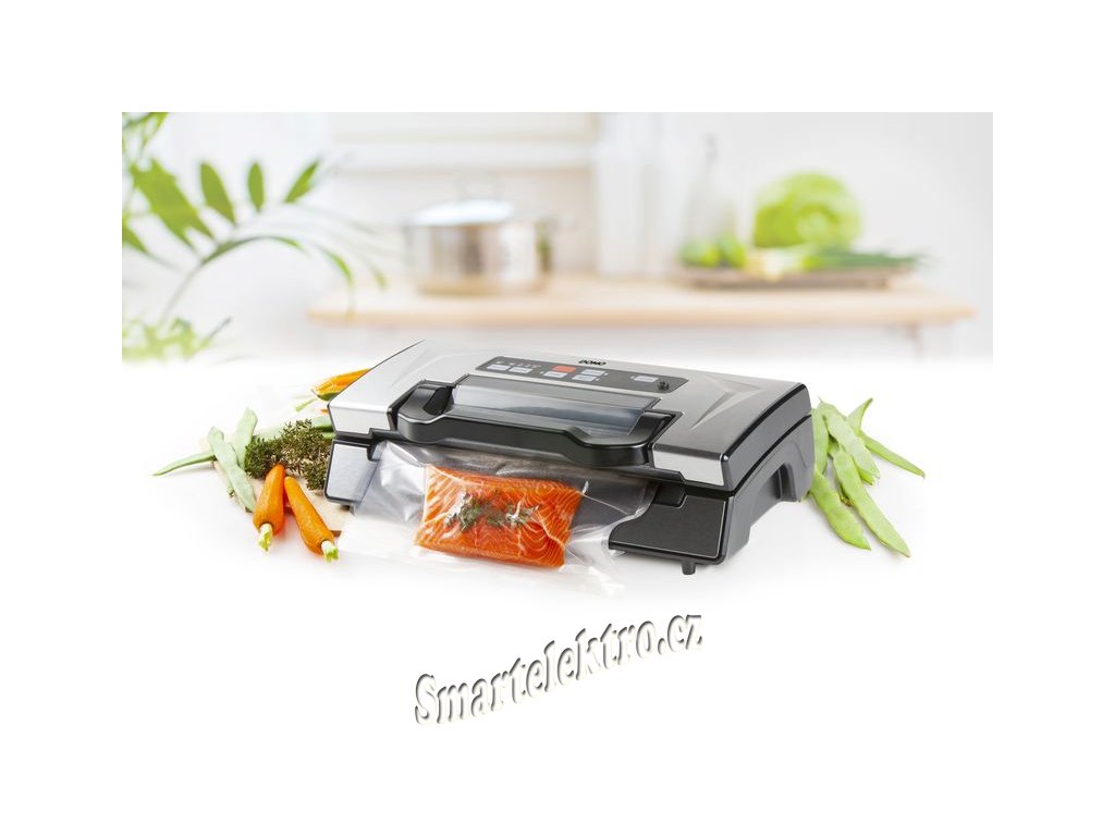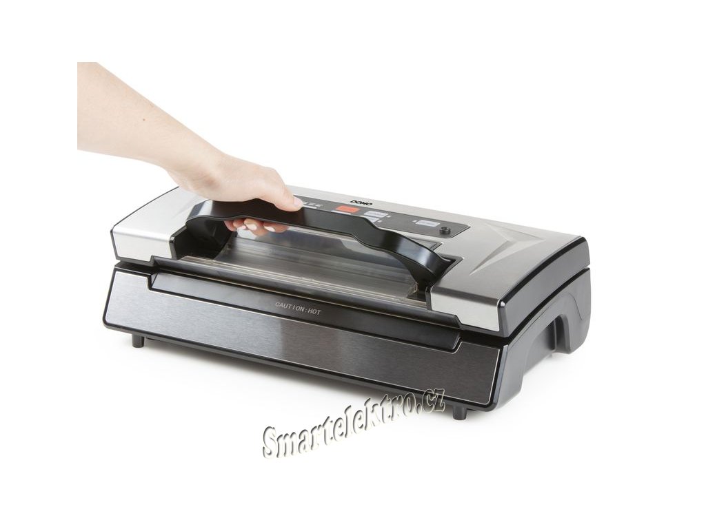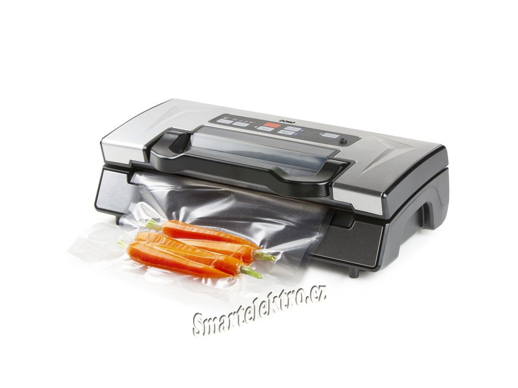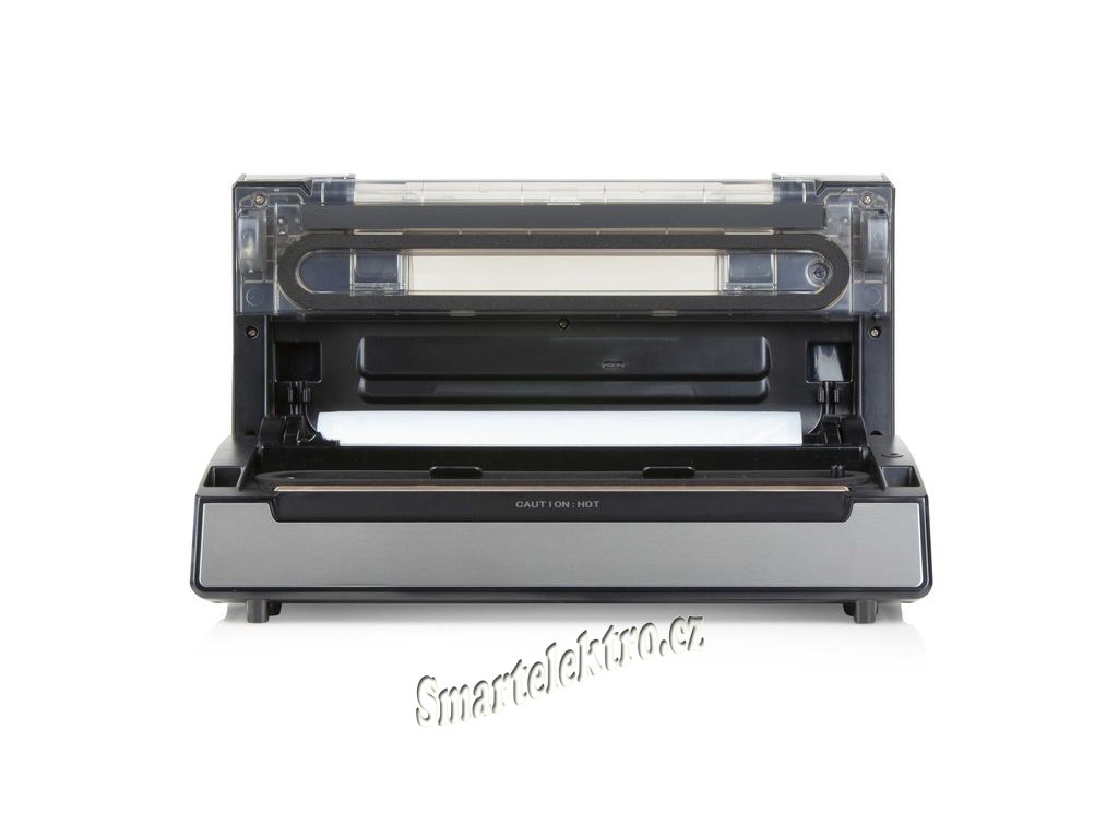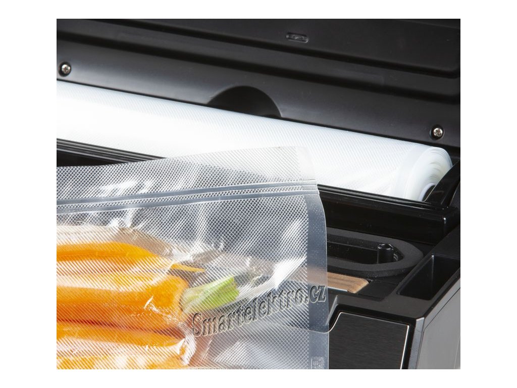 Vakuovačka potravin s integrovaným zásobníkem na roli fólie a řezačkou pro snadné uříznutí fólie na požadovanou délku. Zásobník vakuovačky pojme fólii o šířce až 30 cm a délce 6 metrů. Díky přehlednému ovládacímu panelu si jednoduše můžete nastavit sílu odsávání i pro křehčí suroviny, nebo dobu svařování pro pevný svár i v případě vakuování surovin s vysokým podílem vody. Proces vakuování a svaření fólie můžete plně svěřit automatické funkci, nebo si celý proces řídit příslušnými tlačítky ručně.