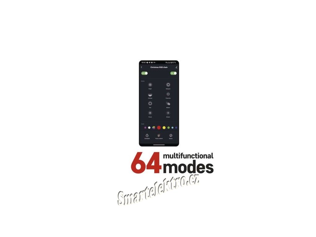 GoSmart LED vánoční řetěz disponuje 64 světelnými módy. Můžete si nastavit osvětlení v teplé nebo studené barvě nebo barevné či blikající osvětlení. Jednotlivé módy se liší barvou světla, typem blikání, postupným rozsvěcováním nebo změnou barvy LED světel. K dispozici máte 8 funkcí blikání a 8 různých RGB barev.