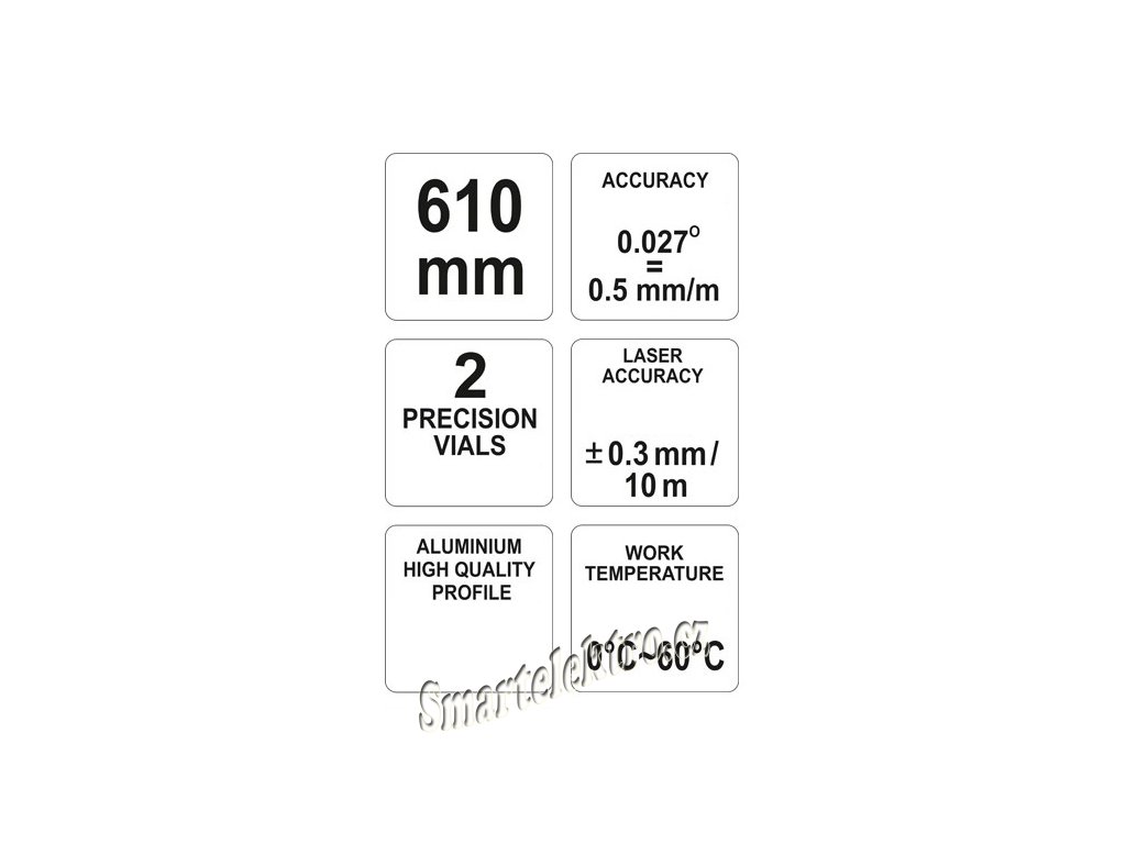 Parametry měření lze odečíst na velkém podsvíceném LCD displeji. Zařízení má paměť, takže lze naměřené hodnoty uložit do paměti přístroje. Poskytuje přesné určení svislých a vodorovných linií. Zvuková signalizace pro dosažení určených parametrů.