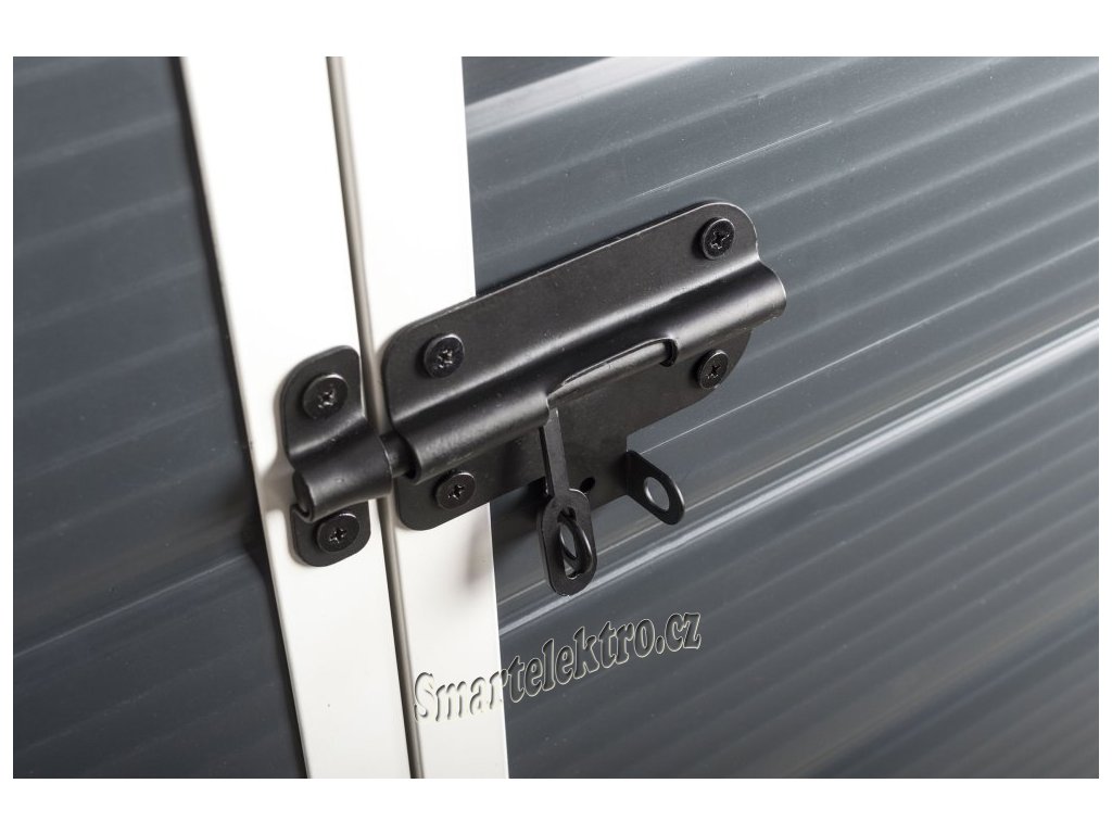 Nad dvoukřídlými dveřmi je umístěna ventilační mřížka, která zajišťuje dostatečné odvětrávání a cirkulaci vzduchu uvnitř domku. Proto se nemusíte bát plísní nebo srážení vody na stěnách v případě náhlých změn teploty.
