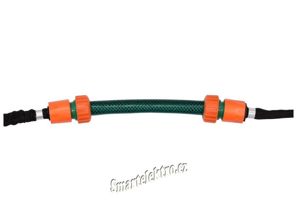 Hadice vybavená 2 konci, oba pro připojení rychlospojkou. Jeden konec s maticí. Šroubovací uzávěr - uzavření systému, odšroubovaný - pokračování systému. Spojení mezi hadicí postřikovače a tradiční hadicí je možné pomocí univerzální rychlospojky. Její výběr závisí na průměru vaší zahradní hadice (1/2", 3/4" nebo 1"). Doporučuje se použít plastové rychlospojky (mosaz nemusí pasovat).