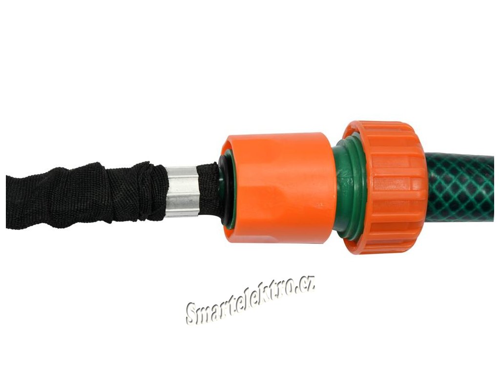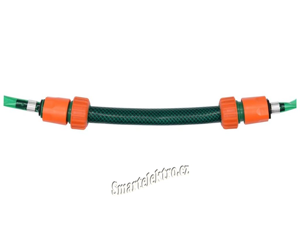 Hadice vybavená 2 konci, oba pro připojení rychlospojkou. Jeden konec s maticí. Šroubovací uzávěr - uzavření systému, odšroubovaný - pokračování systému. Spojení mezi hadicí postřikovače a tradiční hadicí je možné pomocí univerzální rychlospojky. Její výběr závisí na průměru vaší zahradní hadice (1/2", 3/4" nebo 1"). Doporučuje se použít plastové rychlospojky (mosaz nemusí pasovat).